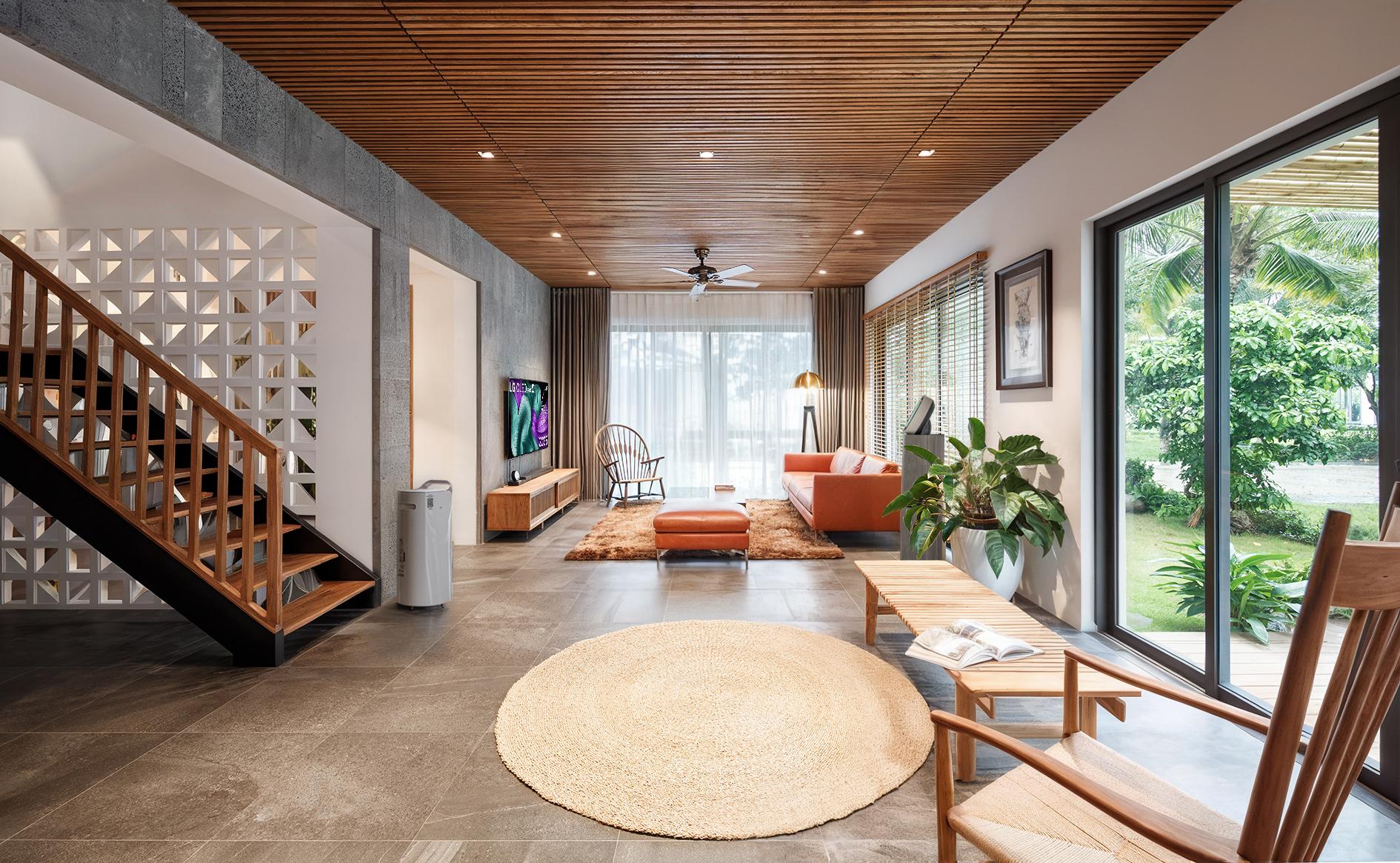 Bước vào tầng trệt, cảm giác đầu tiên là sự khoáng đạt và liền mạch của phòng khách – bếp – cầu thang. Trần ốp nan gỗ chạy dài toàn bộ chiều sâu không gian, kết hợp tường bê tông xám và sàn gạch khổ lớn tạo nên đúng “chất” Industrial: mộc, thô, nhưng không lạnh lẽo. Ánh sáng tự nhiên được đưa vào qua hệ cửa kính lớn ở cuối nhà, giúp không gian luôn sáng và thoáng.