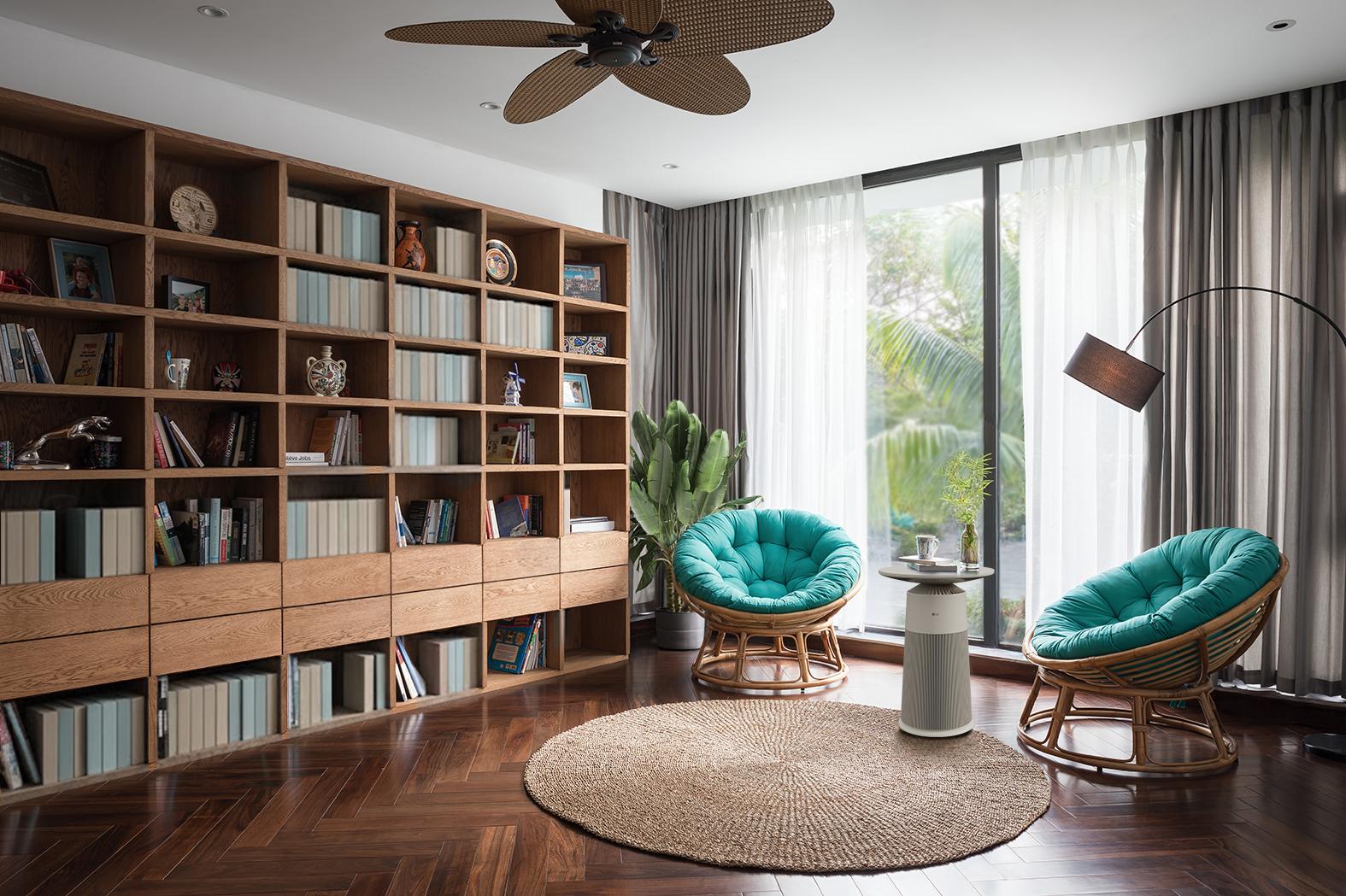 Một không gian thư giãn khác được bố trí với giá sách lớn chạy dọc tường, hai ghế mây tròn đặt cạnh cửa kính lớn nhìn ra mảng xanh bên ngoài. Tại đây, máy lọc khí LG PuriCare AeroFurniture màu trắng được sử dụng như một chiếc bàn phụ nhỏ cạnh ghế ngồi. Thiết kế hai trong một – vừa là máy lọc không khí, vừa là đồ nội thất – giúp thiết bị hòa vào không gian mà không tạo cảm giác “máy móc”. Ở một góc khác của ngôi nhà, phiên bản AeroFurniture màu nâu được phối hợp hài hòa với sàn gỗ và nội thất tông ấm, tạo nên sự thống nhất về màu sắc và cảm giác êm dịu.