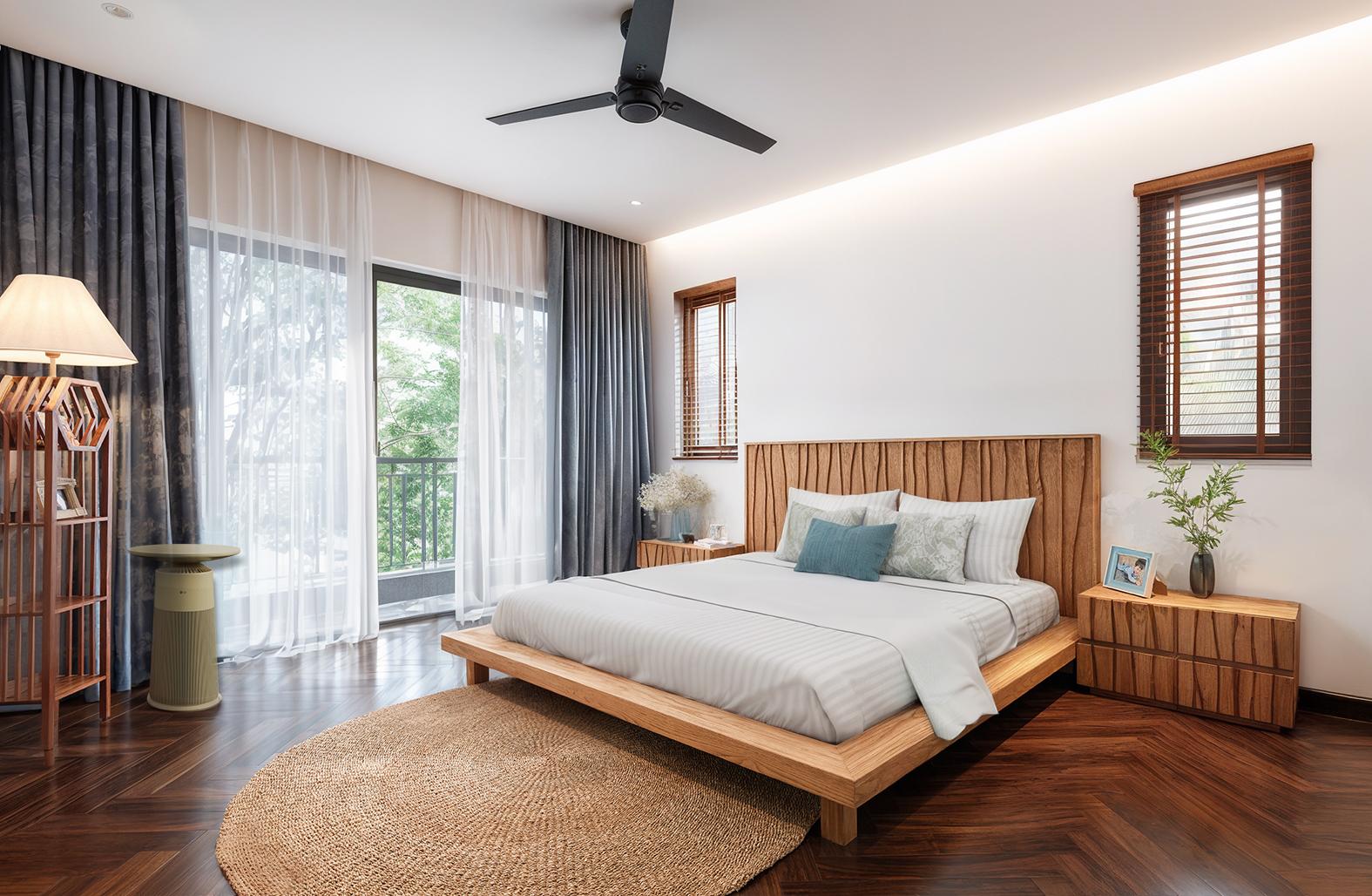 Các phòng ngủ trong Sọc House đều được bố trí cửa sổ lớn, ban công và rèm hai lớp để kiểm soát ánh sáng tự nhiên. Nội thất gỗ tông ấm kết hợp sàn gỗ xương cá tạo cảm giác dễ chịu, phù hợp cho không gian nghỉ ngơi dài hạn.