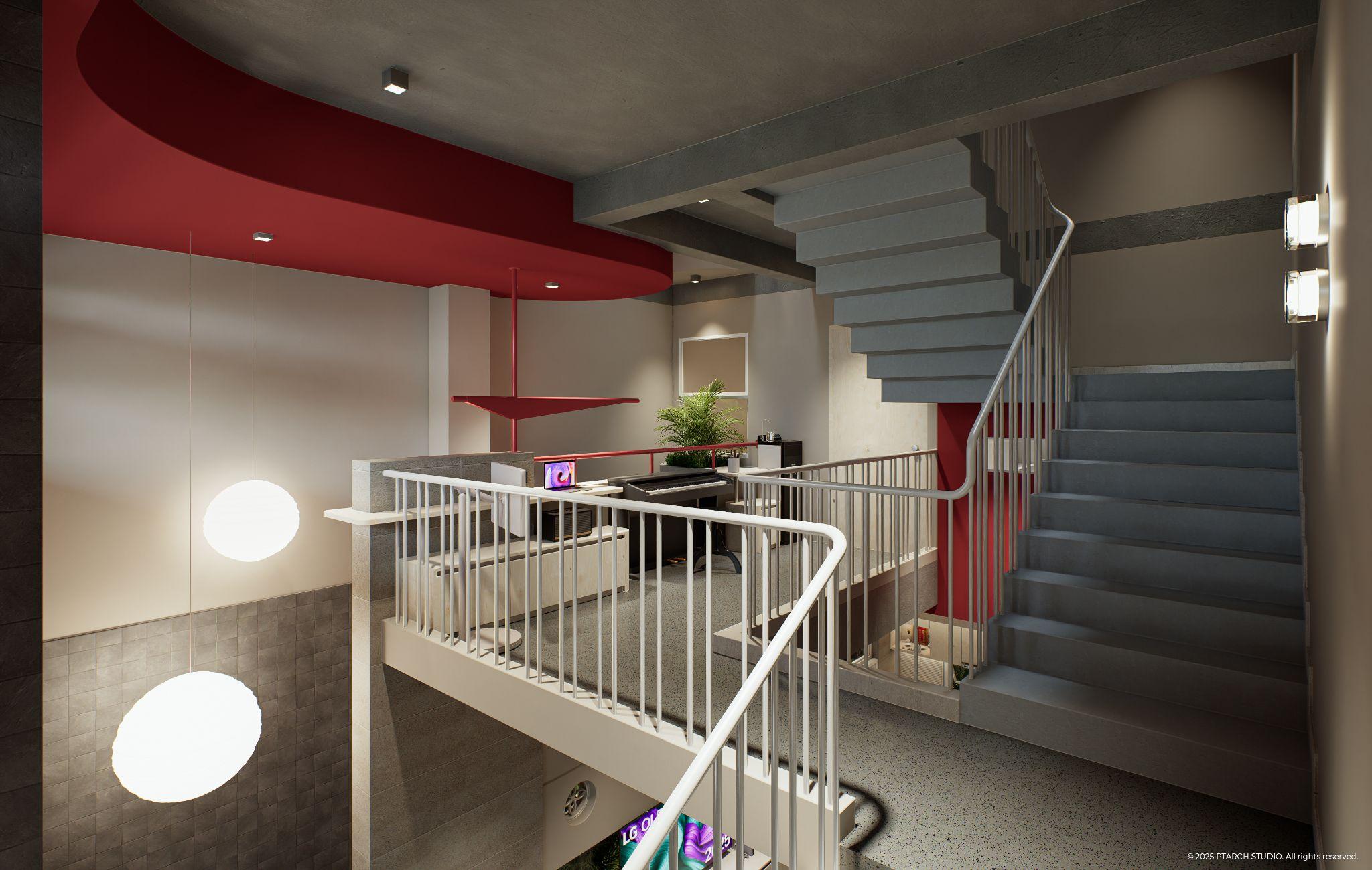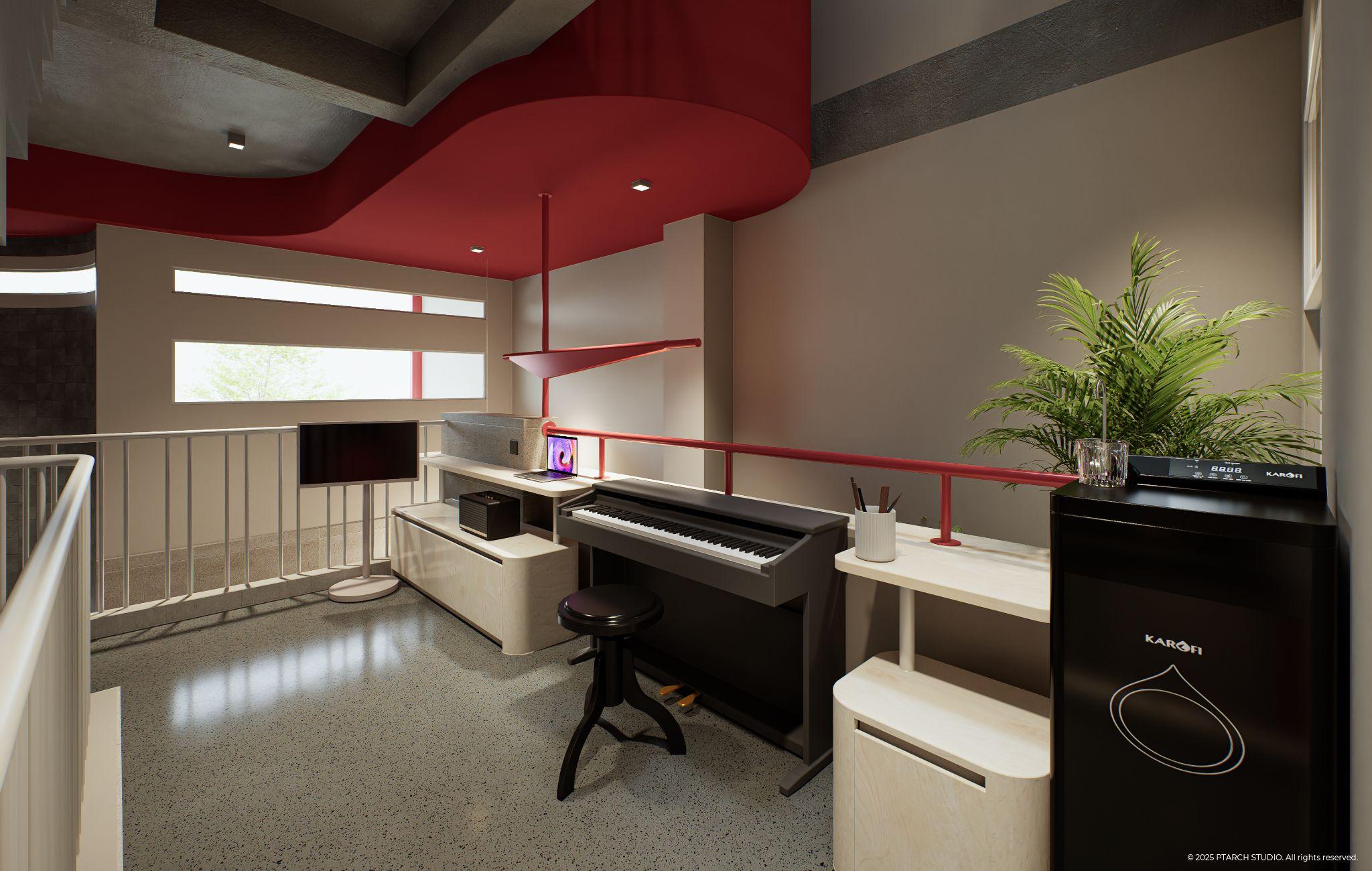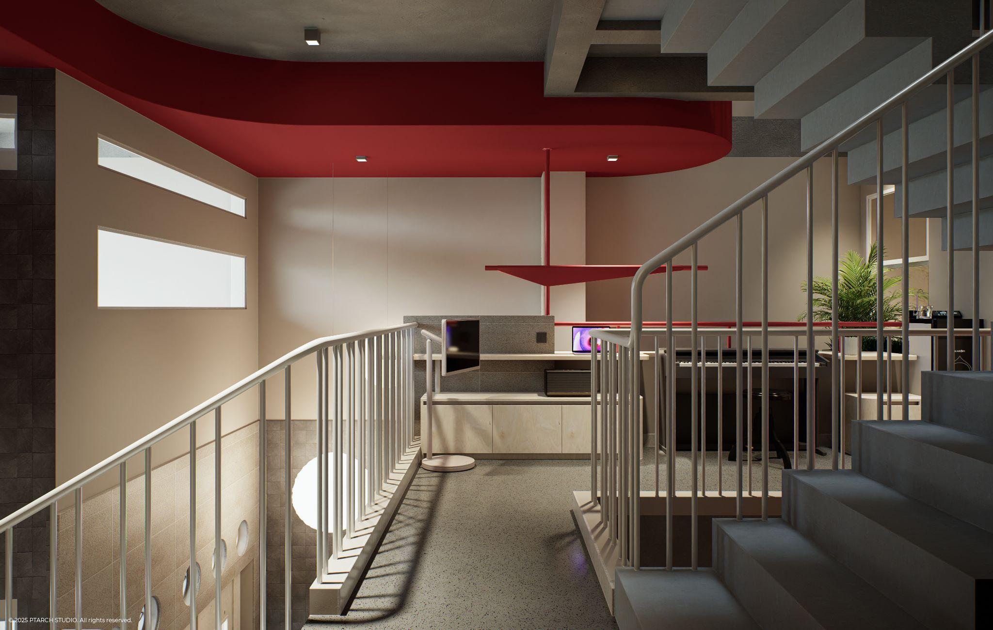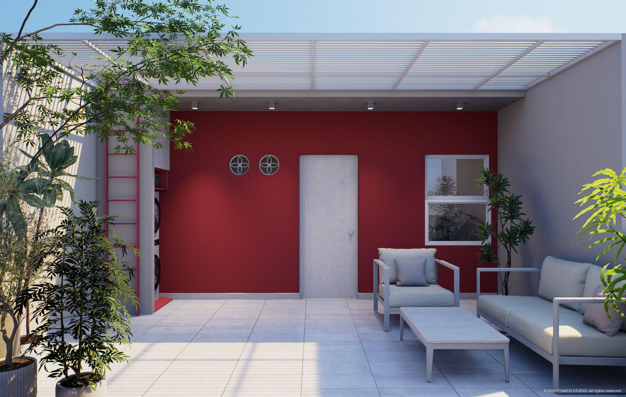 Từ bên ngoài, công trình nổi bật bởi mặt đứng đa lớp với hình khối rỗng – đặc linh hoạt, vừa đảm bảo thông gió, cản nắng, lấy sáng tự nhiên, vừa tạo nên sự riêng tư tinh tế. Vật liệu bê tông mài, gạch thô, gỗ sáng màu và tông đỏ đặc trưng được kết hợp theo tinh thần Modernist Việt Nam – hiện đại nhưng không lạnh lẽo.