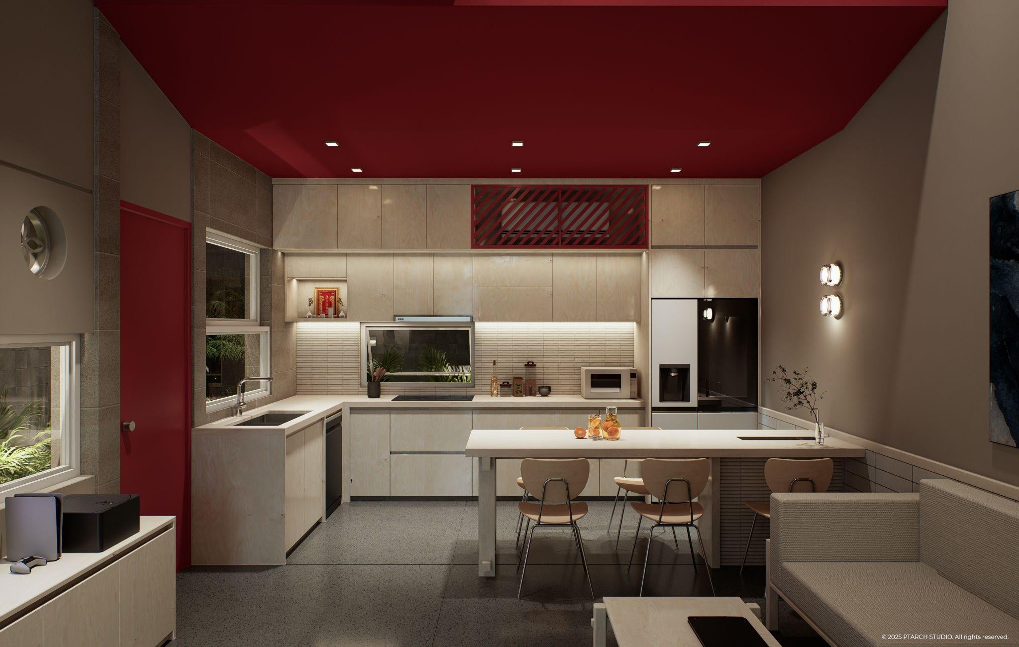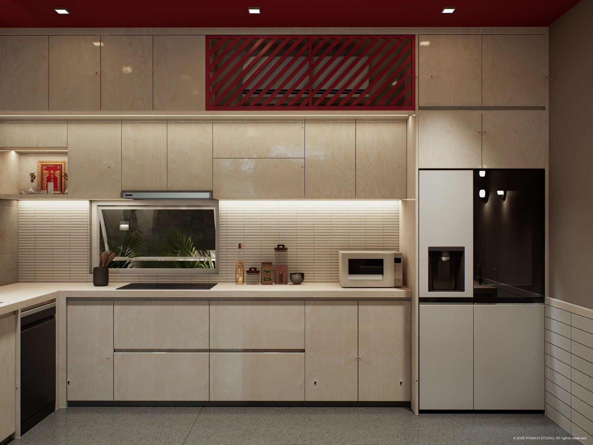 Khu bếp hiện đại với hệ tủ sáng màu, điểm nhấn trần đỏ nổi bật và tủ lạnh Instaview LG đặt gọn vào tường