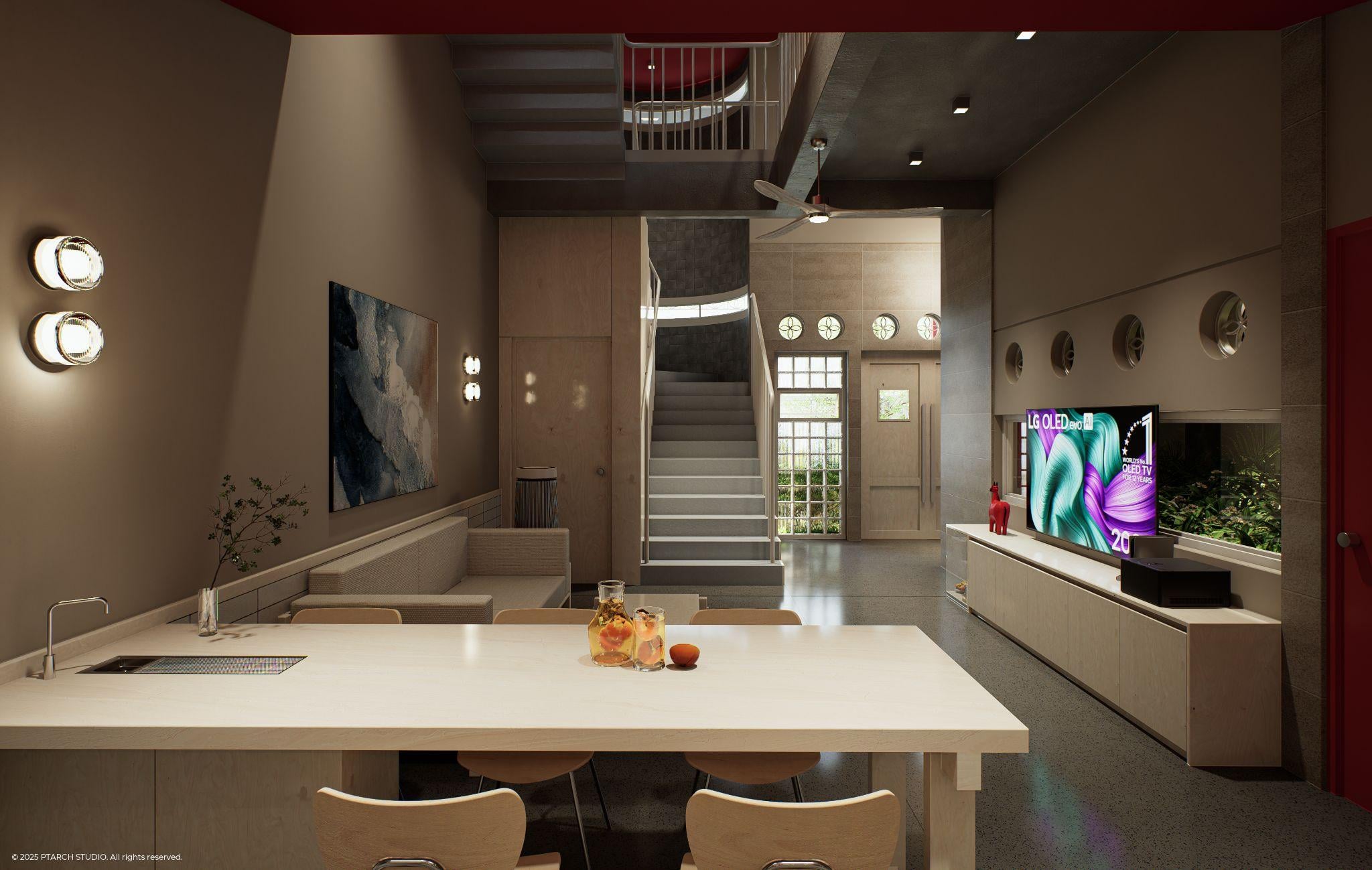 Không gian phòng khách – bếp liên thông, tông màu ấm và ánh sáng gián tiếp tạo sự ấm cúng, TV OLED LG như hoà vào thiết kế