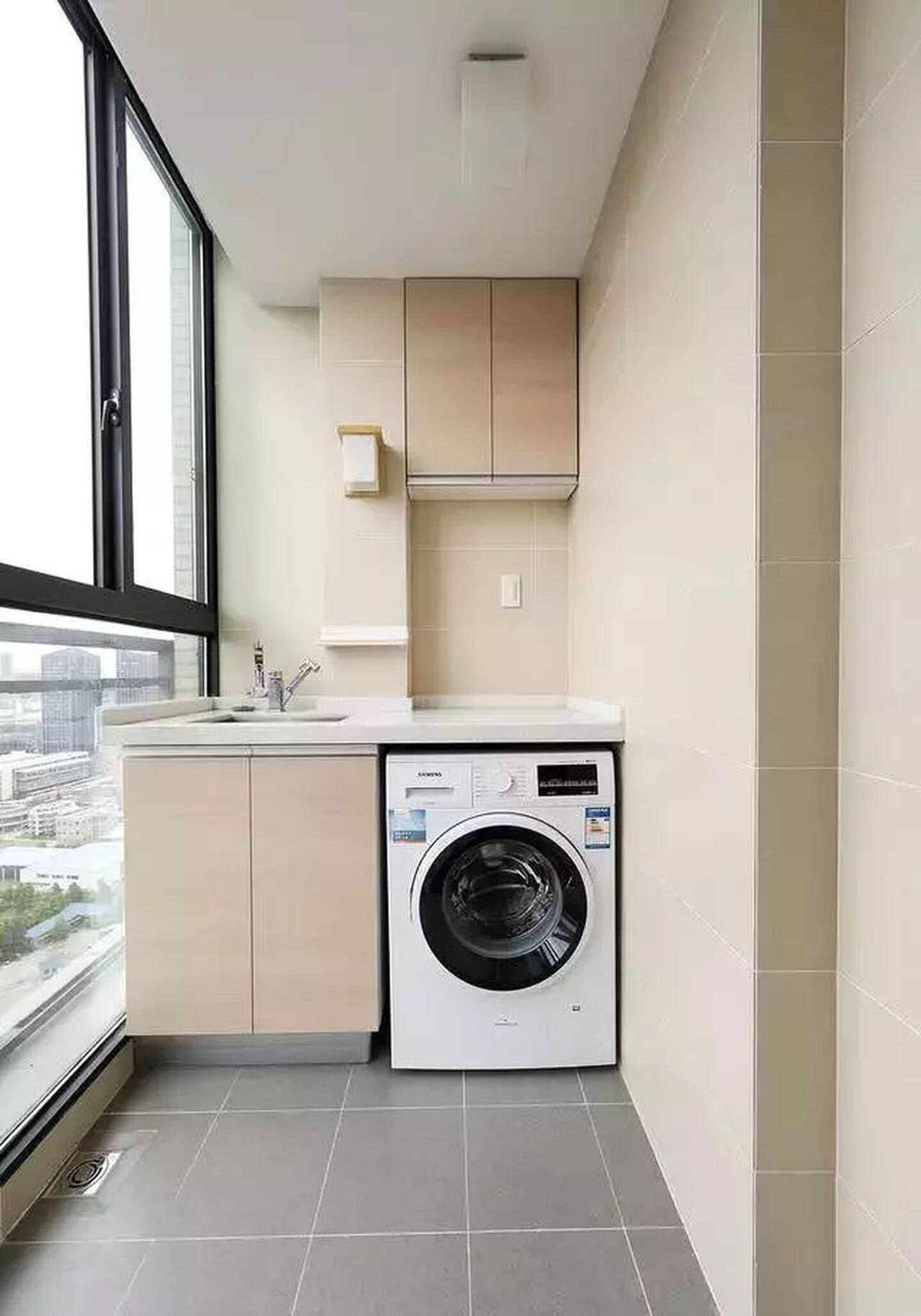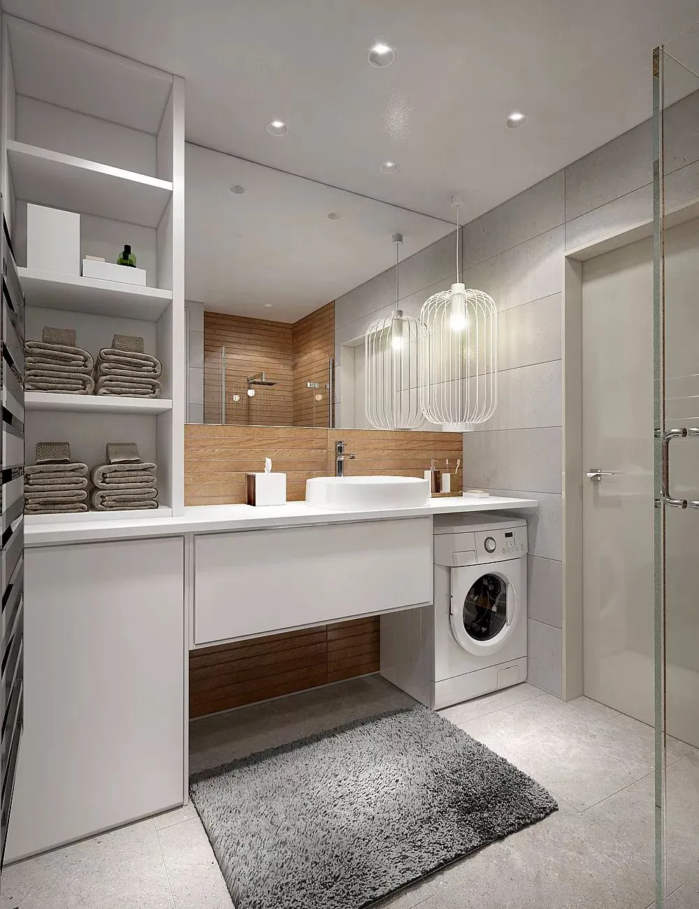 Với nhiều gia đình, phòng tắm là không gian đặt máy giặt khá phổ biến vì thuận tiện về đường cấp nước, thoát nước và không chiếm thêm diện tích sinh hoạt. Việc giặt giũ cũng gọn gàng hơn khi quần áo bẩn có thể đưa thẳng vào máy sau khi tắm rửa.