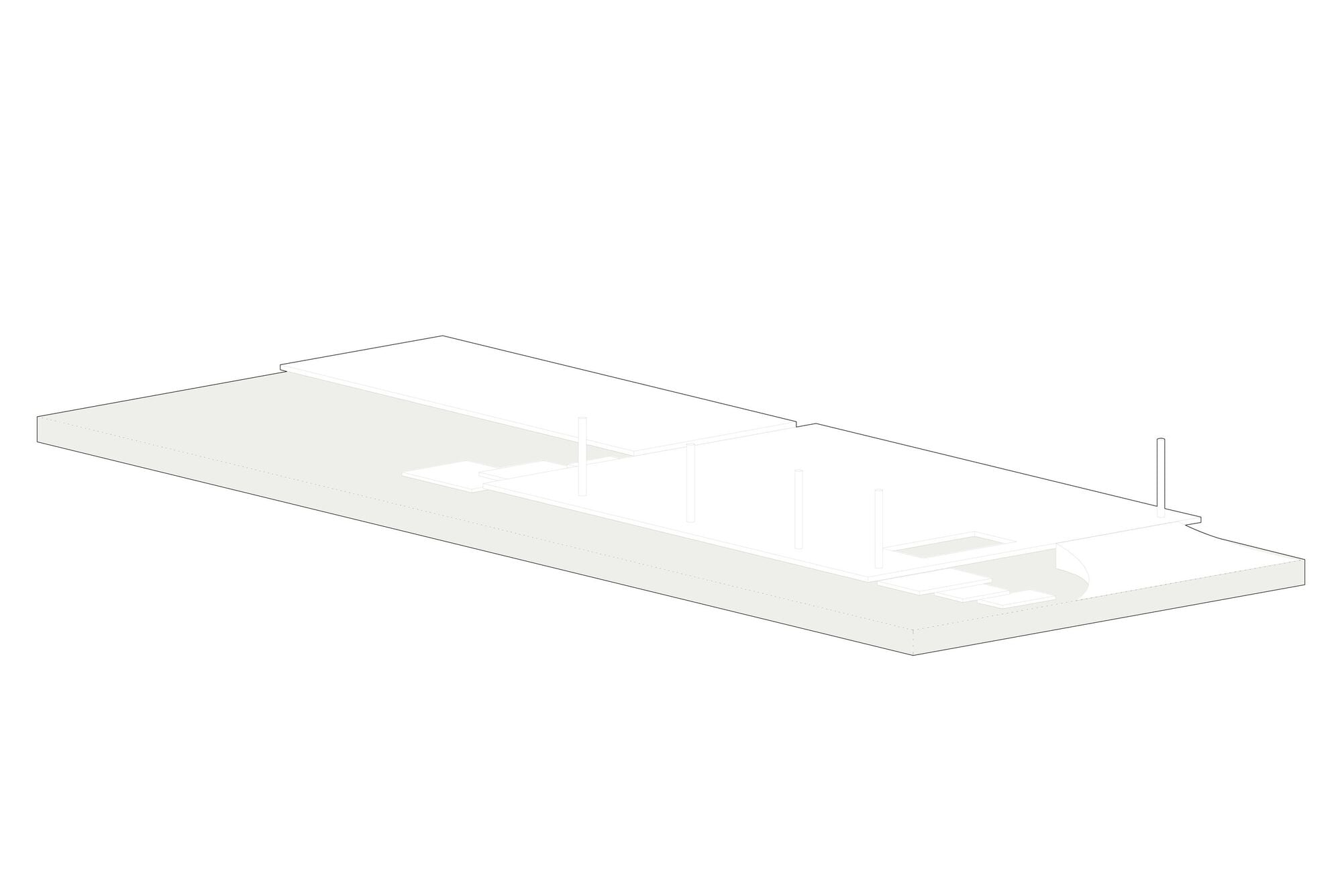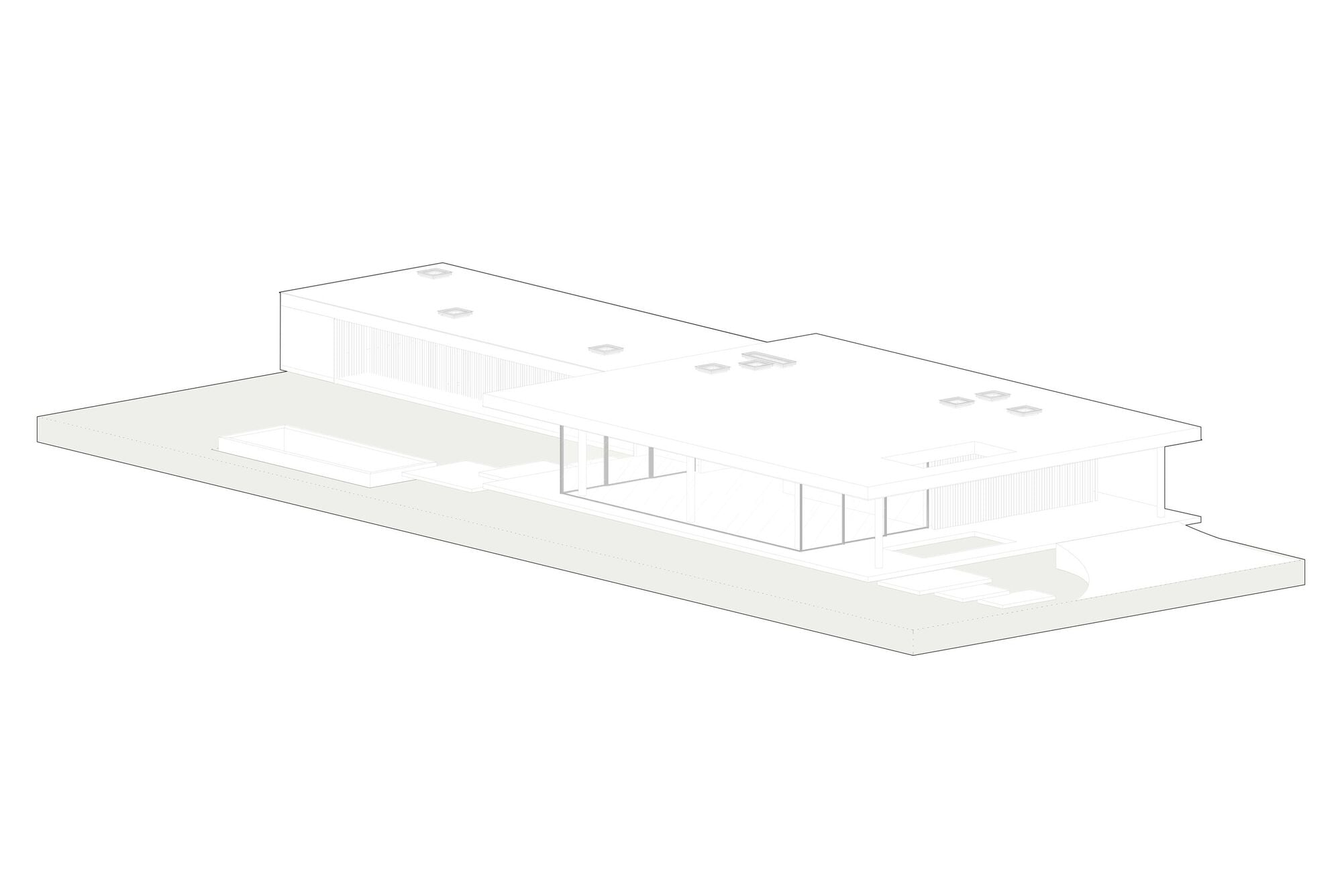 Đồng thời một trong những giải pháp thông minh nhất của thiết kế là cách xử lý khu vực bếp và giặt giũ. Thay vì để lộ các không gian chức năng này, kiến trúc sư đã giấu chúng vào một khối hộp đặc nằm lọt thỏm bên trong pavilion kính vừa phân chia ranh giới ước lệ giữa các khu vực, vừa đảm bảo sự kín đáo cần thiết cho việc bếp núc và dọn dẹp mà không làm gián đoạn sự liền mạch của không gian tổng thể. Chúng còn được tận dụng để trở thành nơi trưng bày các tác phẩm nghệ thuật hoặc điểm nhấn trang trí.