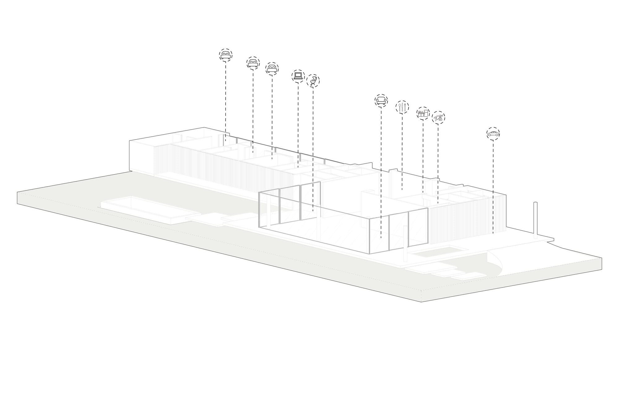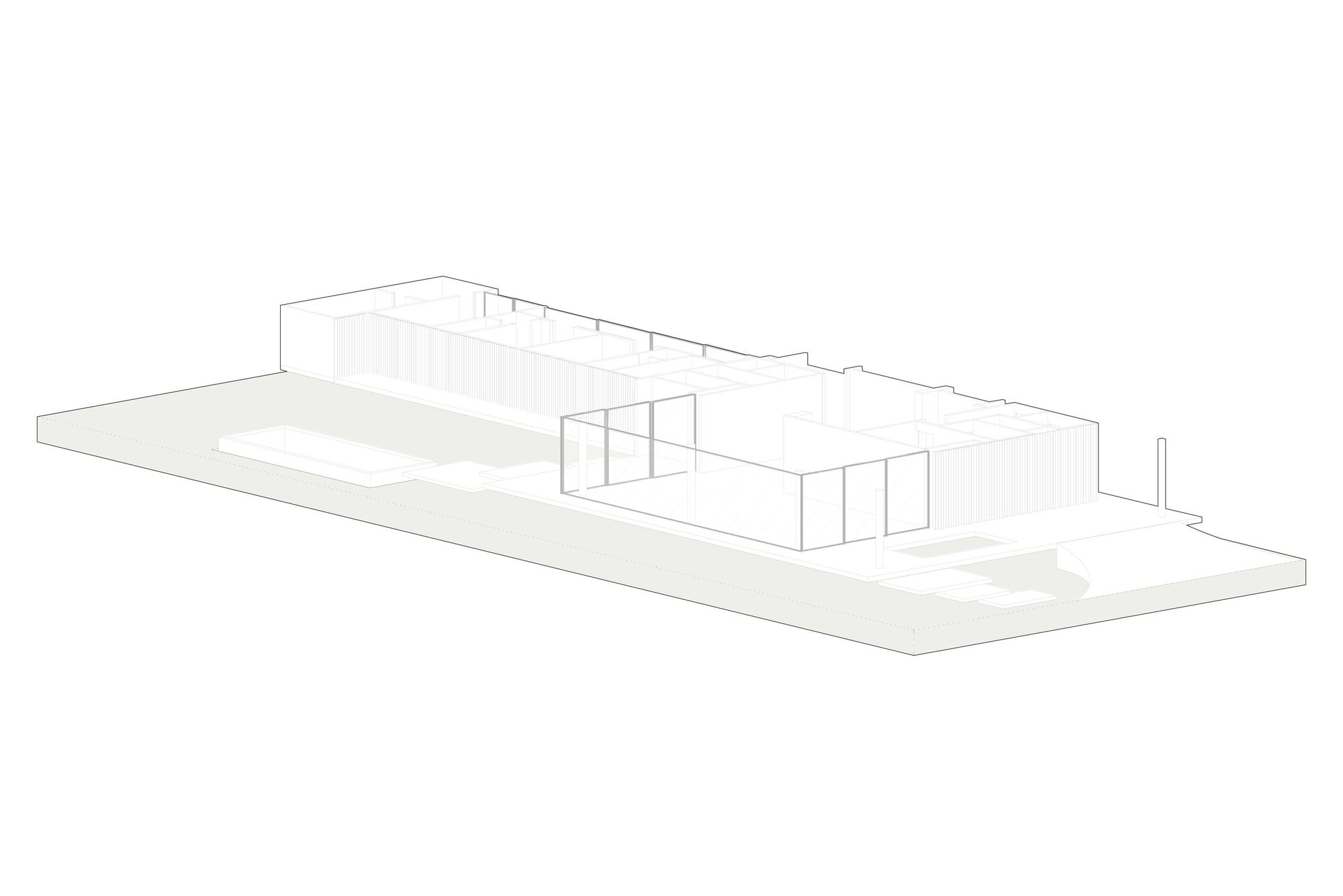 Các phòng ngủ được liên kết với nhau bởi một sân hiên dài rộng. Sân hiên này đóng vai trò là vùng đệm chuyển tiếp, đồng thời là lối đi tắt dẫn trực tiếp ra khu vực hồ bơi. Gia chủ có thể thức dậy, bước ra khỏi phòng ngủ và ngay lập tức hòa mình vào làn nước mát của hồ bơi mà không cần đi qua phòng khách.