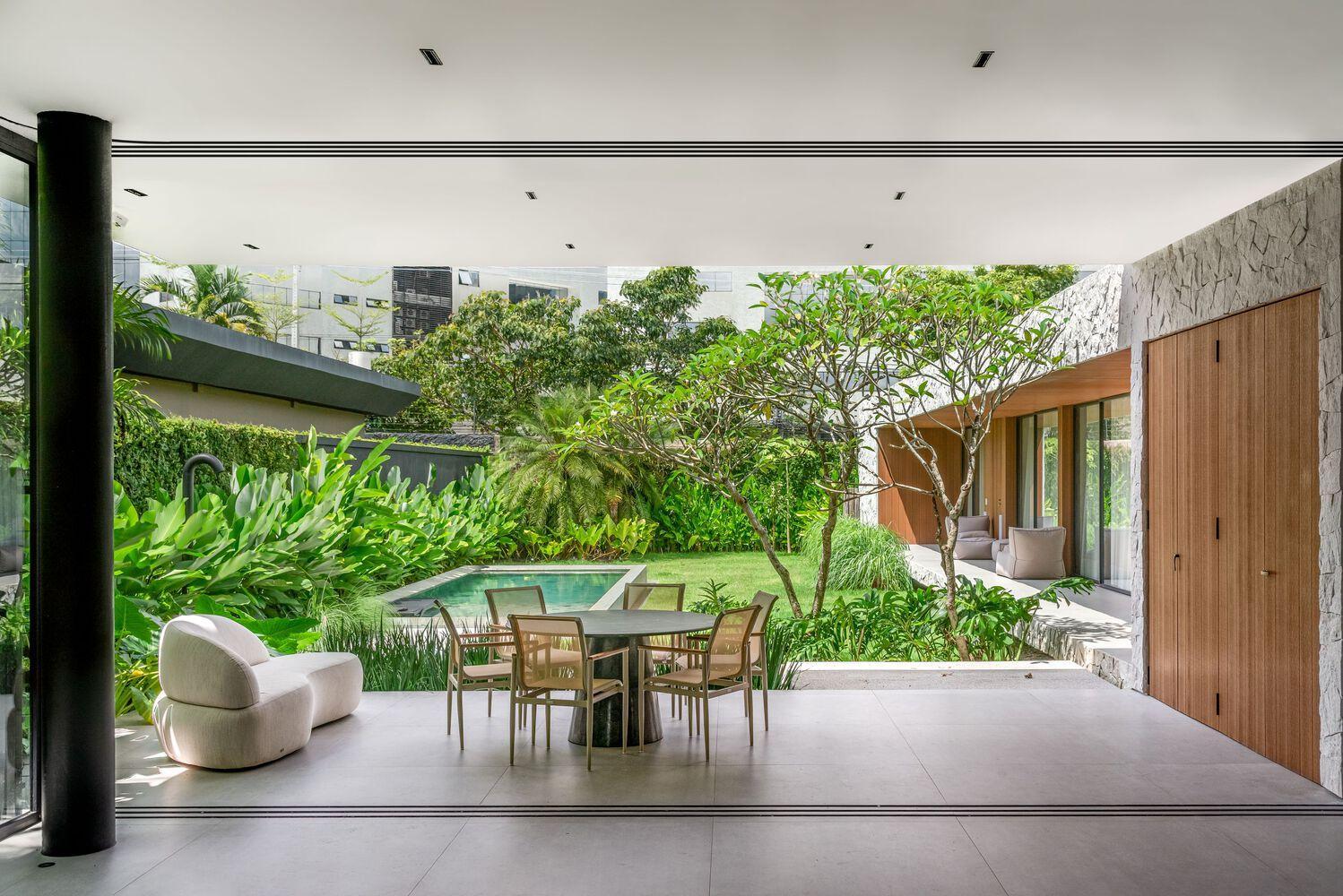 Hệ vách kính kịch trần có thể mở rộng tối đa biến phòng khách thành một mái hiên lớn kết nối trực tiếp với sân vườn