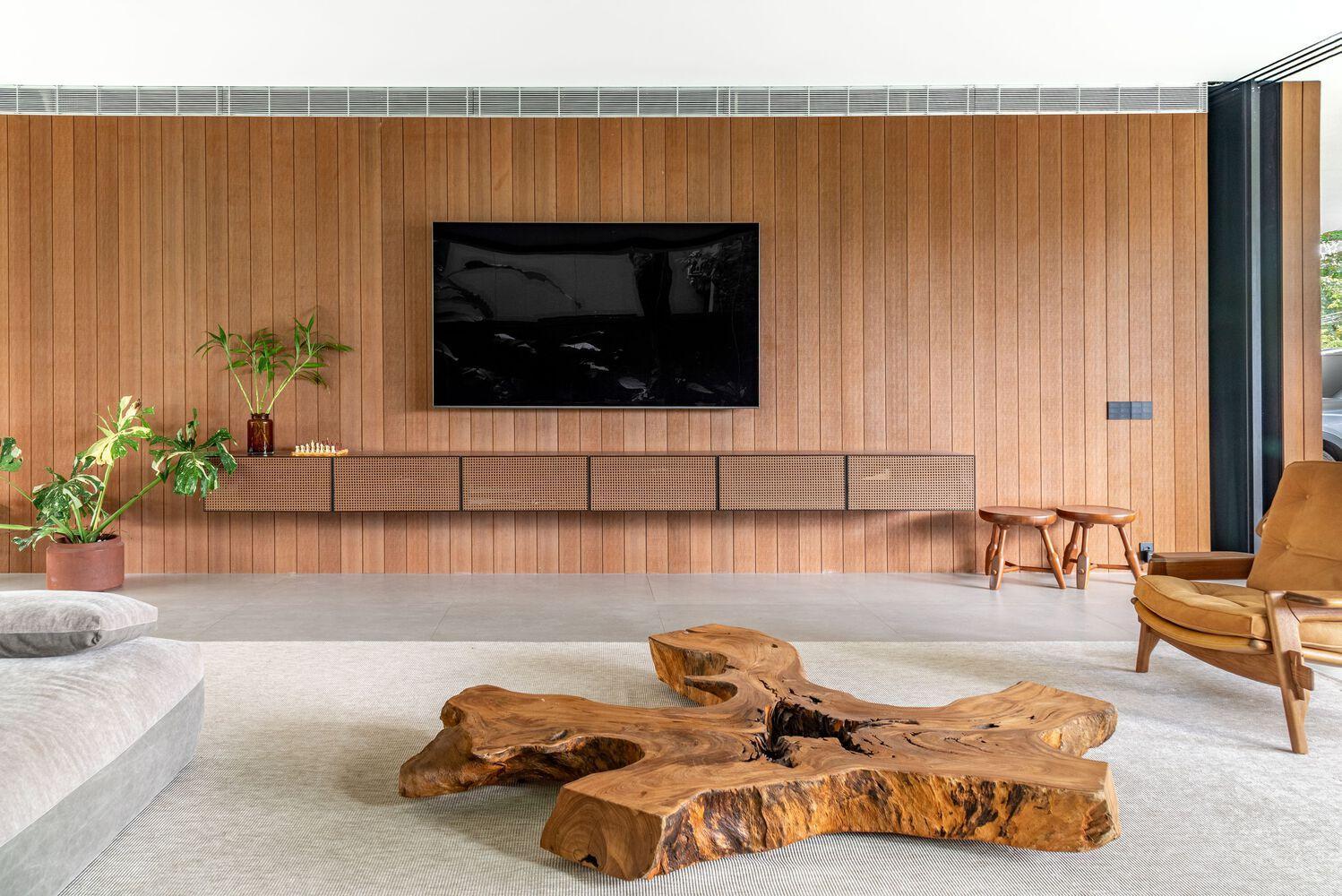 Jenga House là minh chứng xuất sắc cho phong cách Tropical Modernism kết hợp với chủ nghĩa tối giản nhờ kiểm soát chặt chẽ bảng màu vật liệu, sử dụng nội thất phù hợp kết hợp các giải pháp thiết kế thụ động thông minh. Gỗ tự nhiên được sử dụng cho trần, ốp tường, hệ lam và sàn nội thất mang lại cảm giác ấm cúng, gần gũi tạo nên sự cân bằng hoàn hảo cho cảm xúc người ở. Kính được sử dụng tối đa dưới dạng các vách ngăn lớn từ sàn đến trần, xóa nhòa ranh giới vật lý, đưa ánh sáng len lỏi vào từng ngóc ngách. Thiết kế mở tối đa giúp ban ngày ngôi nhà hầu như không cần sử dụng đèn điện nhân tạo.