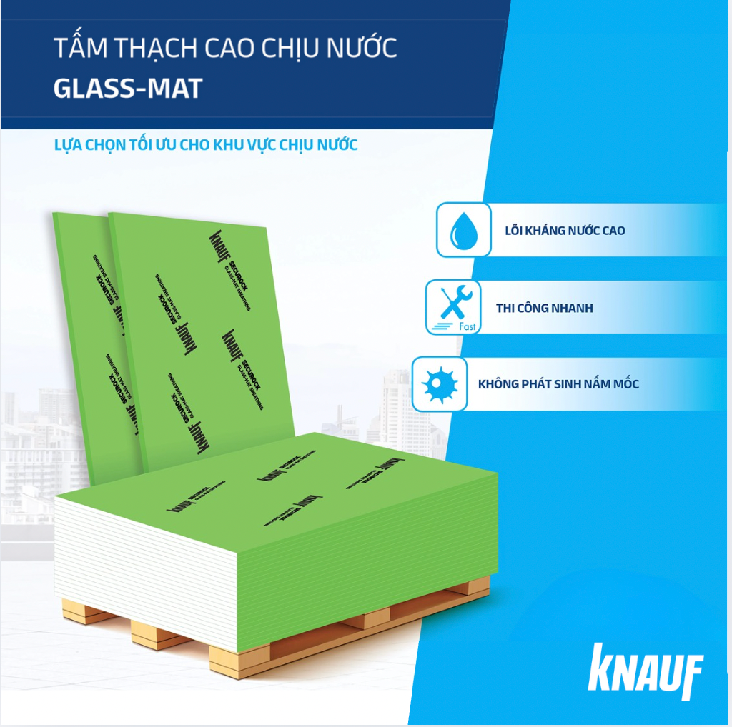 Tấm thạch cao chịu nước có đặc điểm nhận dạng rõ ràng với lớp giấy xanh lá (Nguồn: Knauf Việt Nam)