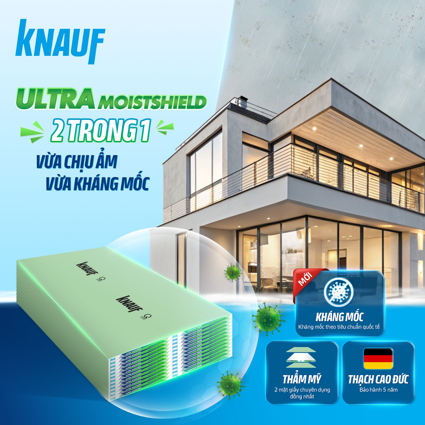 Tấm thạch cao chịu ẩm cao cấp Ultra MoistShield là giải pháp phù hợp cho các không gian có độ ẩm cao như nhà tắm, nhà vệ sinh, phòng bếp, hoặc tại các vùng miền có khí hậu nồm ẩm, ven biển - nơi dễ phát sinh hiện tượng ngưng tụ hơi nước. Lõi kháng nước tốt hơn 20% so với tấm chịu ẩm thông thường kết hợp với khả năng kháng mốc tiên tiến giúp bề mặt trần, vách phòng bếp, phòng giặt, nhà vệ sinh (khu vực gián tiếp) đẹp, hạn chế ố vàng và nấm mốc.