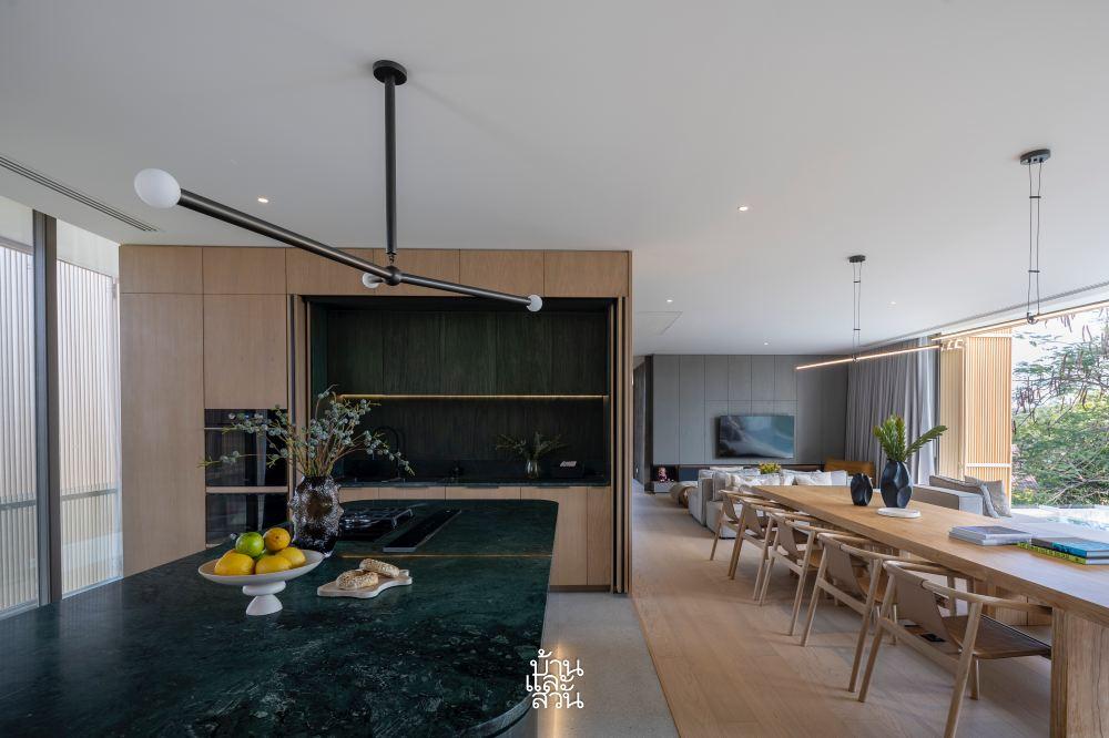 Khu vực bếp hiện đại với bàn đảo đá xanh nổi bật, trần gỗ ấm áp