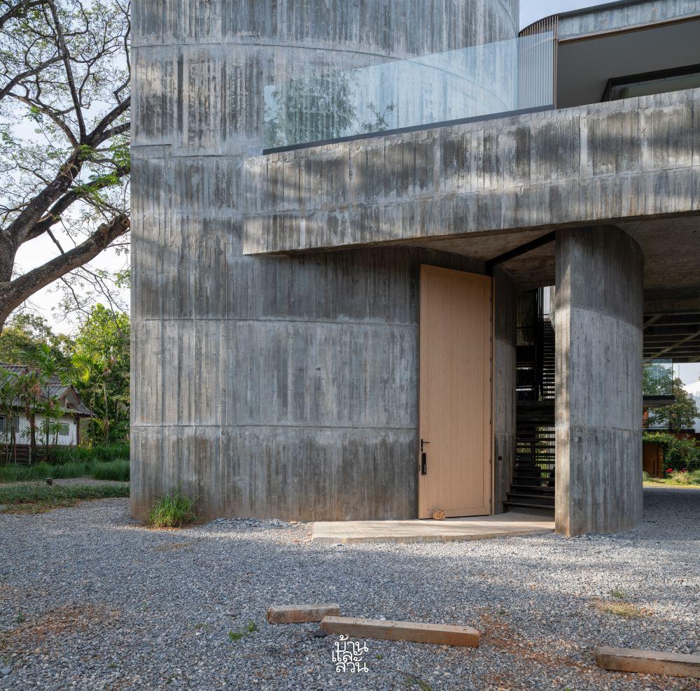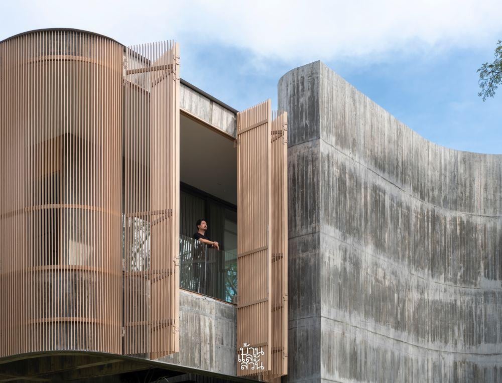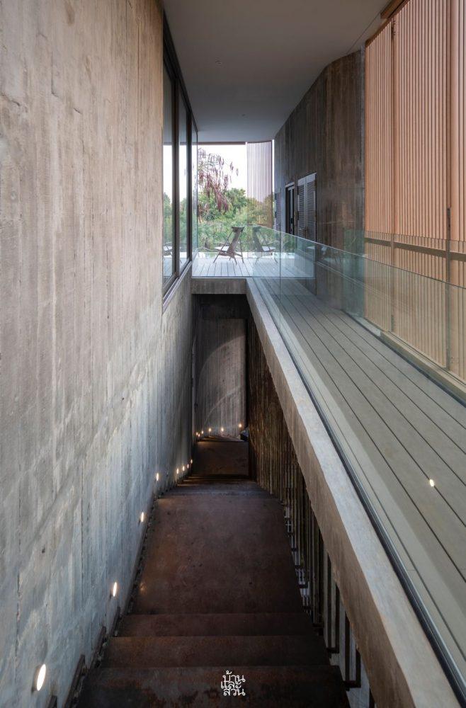 Hệ thống hành lang bao quanh nhà cho phép gia chủ đi dạo 360 độ, cảm nhận sự thay đổi của ánh sáng và gió ở mọi hướng. Những bức tường bê tông bên ngoài được thiết kế có chủ đích với các bề mặt cong để lộ vân gỗ cốp pha, tạo nên những bức tranh bóng đổ đầy nghệ thuật khi nắng chiều chiếu qua những tán cây cổ thụ.