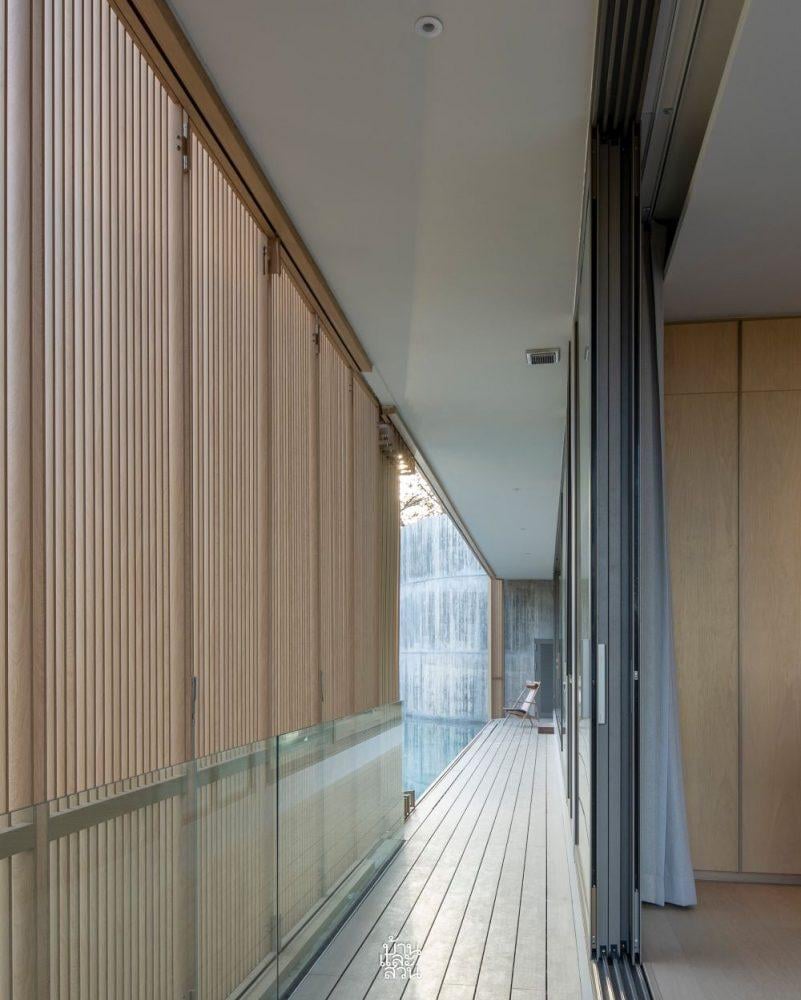Hành lang dài chạy dọc theo ngôi nhà, được bao bọc bởi lớp áo giáp lam gỗ