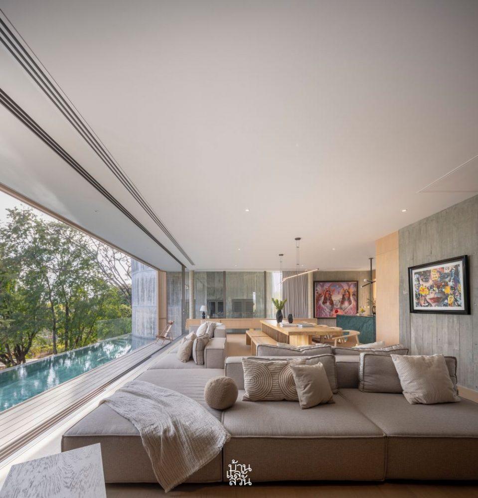 Không gian sinh hoạt chung rộng lớn, kết nối liền mạch phòng khách, bàn ăn và hồ bơi