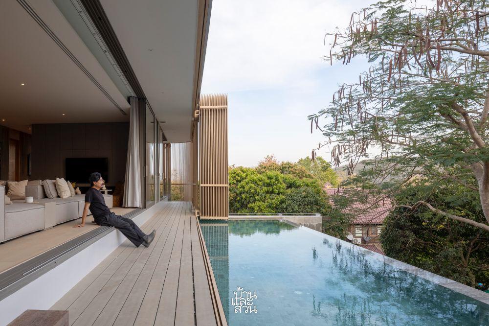 Hồ bơi vô cực bên hiên nhà, nơi gia chủ có thể thư giãn và ngắm nhìn trọn vẹn thung lũng