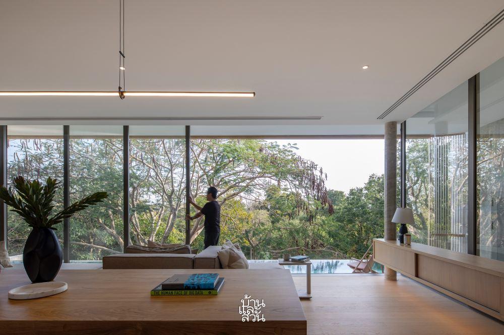 Hệ cửa kính trượt kịch trần giúp xóa nhòa ranh giới trong - ngoài, đưa thiên nhiên ùa vào phòng khách