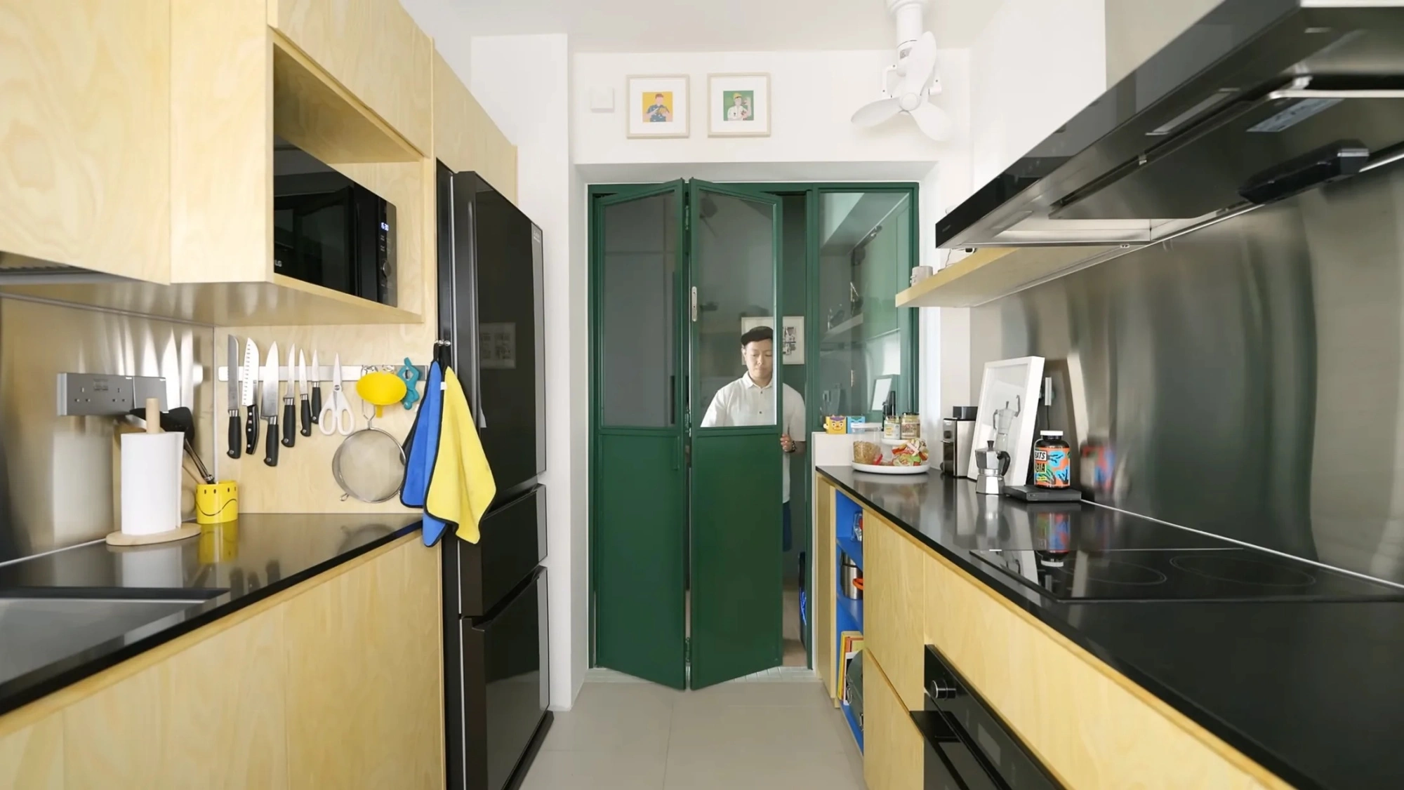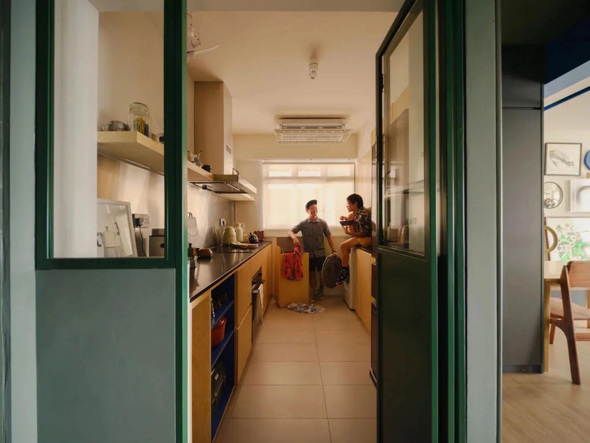Căn hộ 47m2 ở Singapore mở rộng bếp thêm 20cm và lắp cửa gấp kính trong để tăng độ thoáng và giữ kết nối không gian