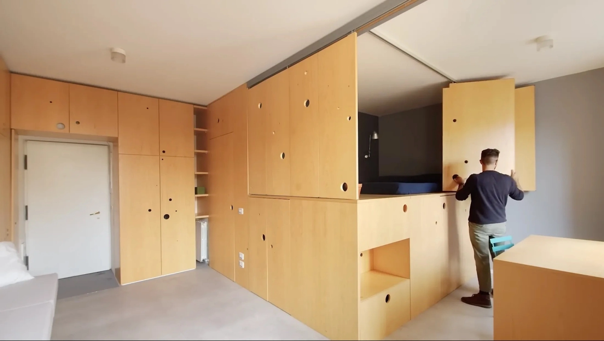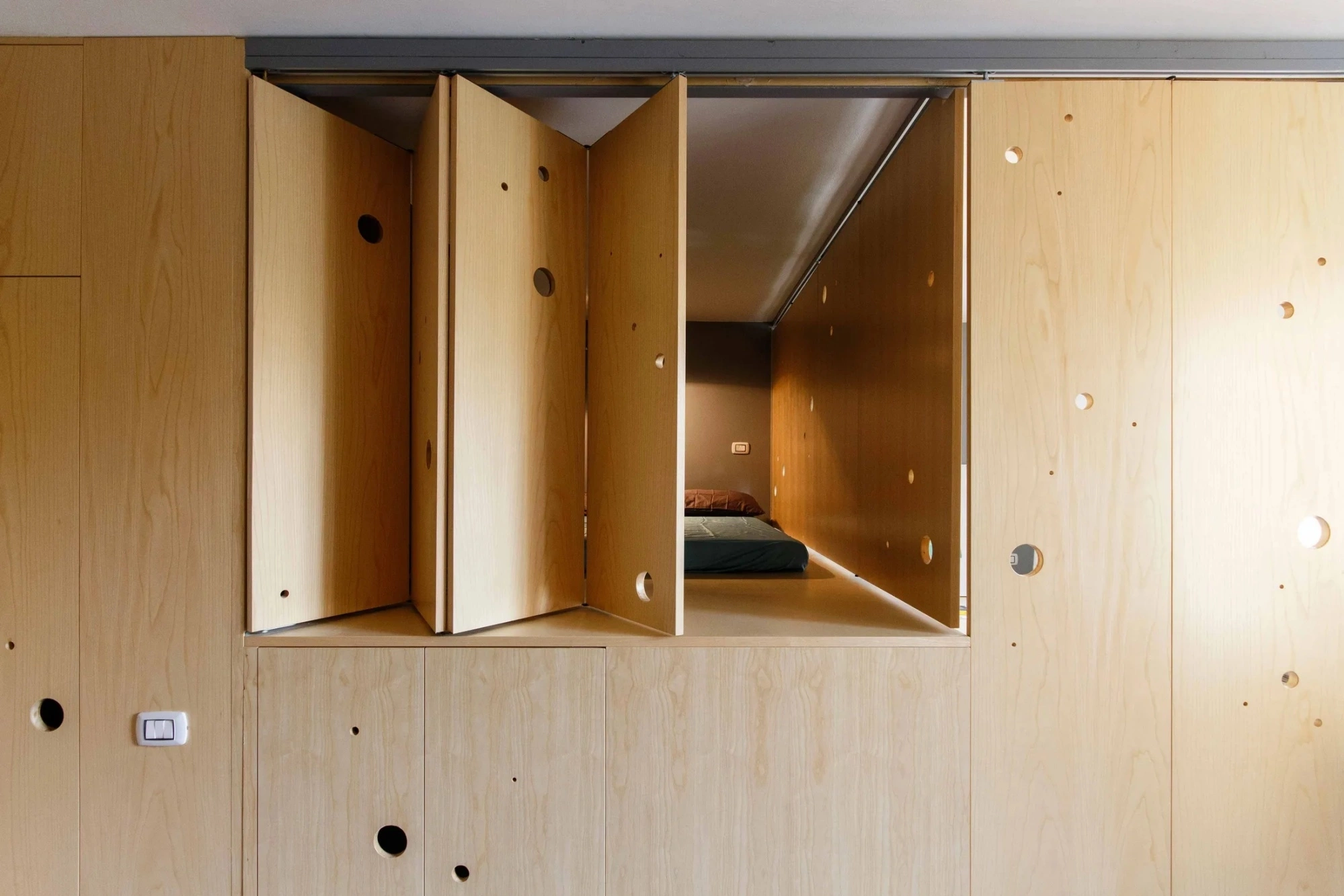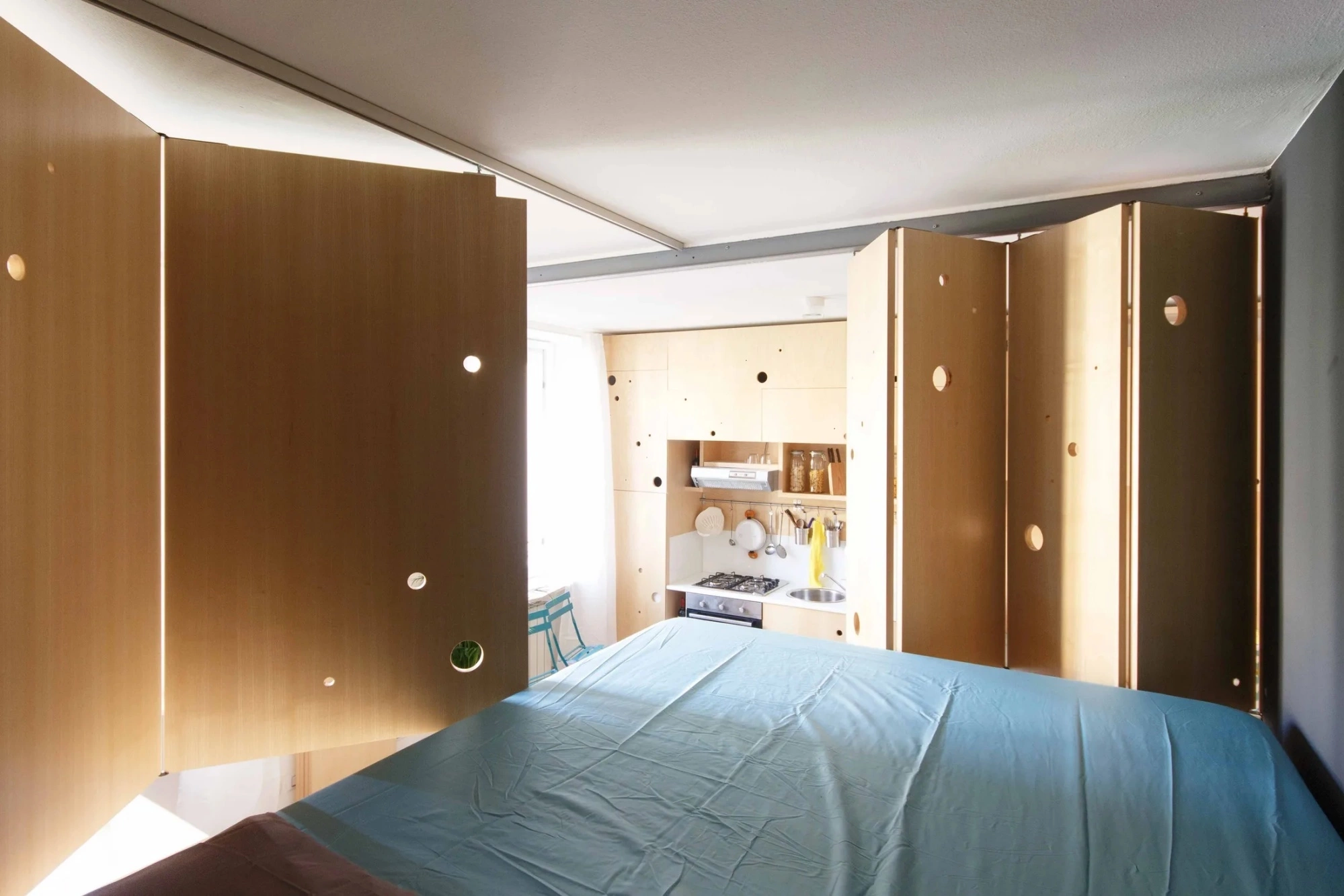 Giường ngủ đặt ở trung tâm và được bao quanh bởi vách gấp gỗ; khi đóng lại, vách tách biệt không gian nghỉ ngơi và khiến giường hòa vào tổng thể sinh hoạt chung
