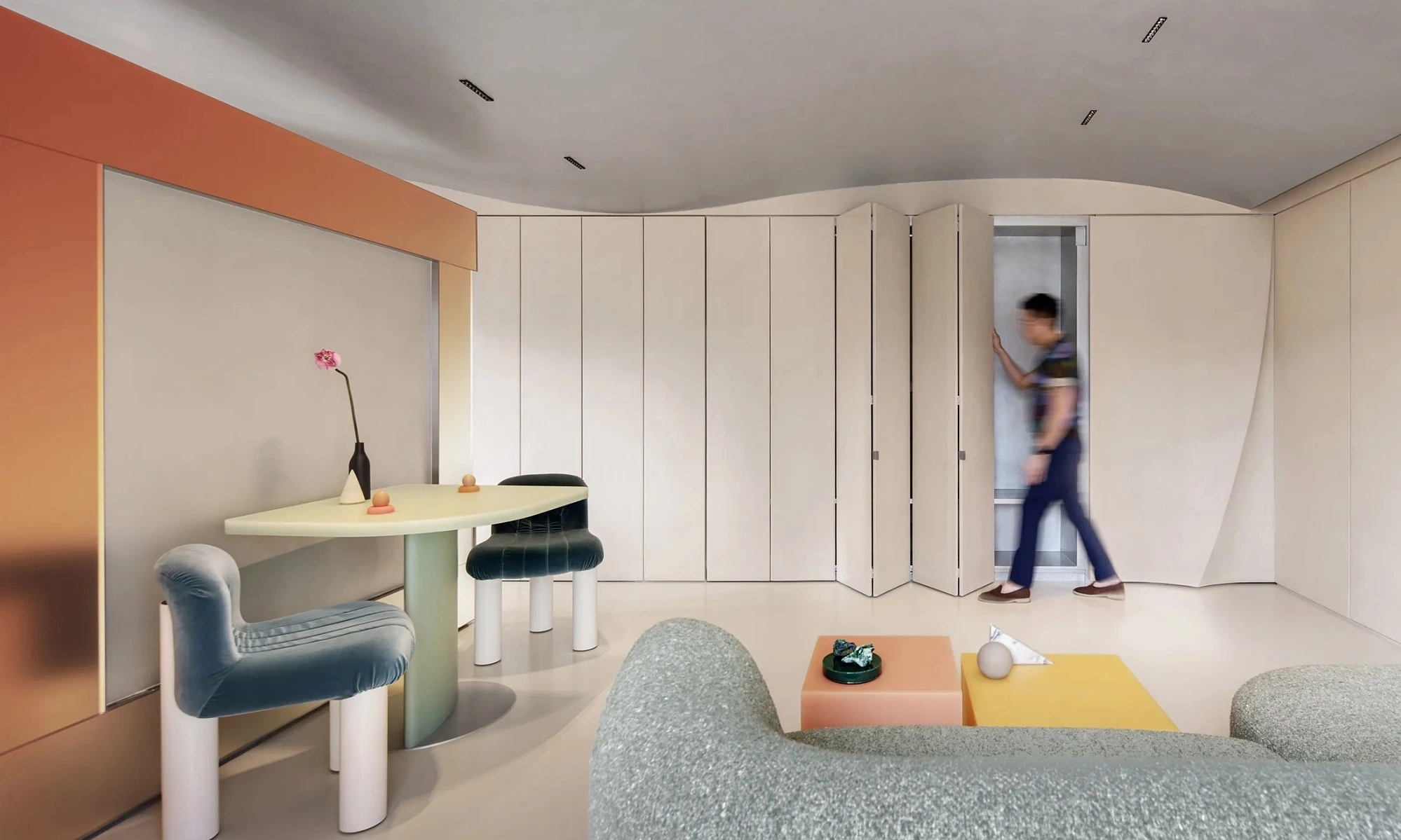 Toàn bộ tường ngăn trong căn hộ được thay bằng hệ cửa gấp ẩn, giúp giấu kho lưu trữ, tạo cảm giác rộng và thoáng hơn cho không gian sống
