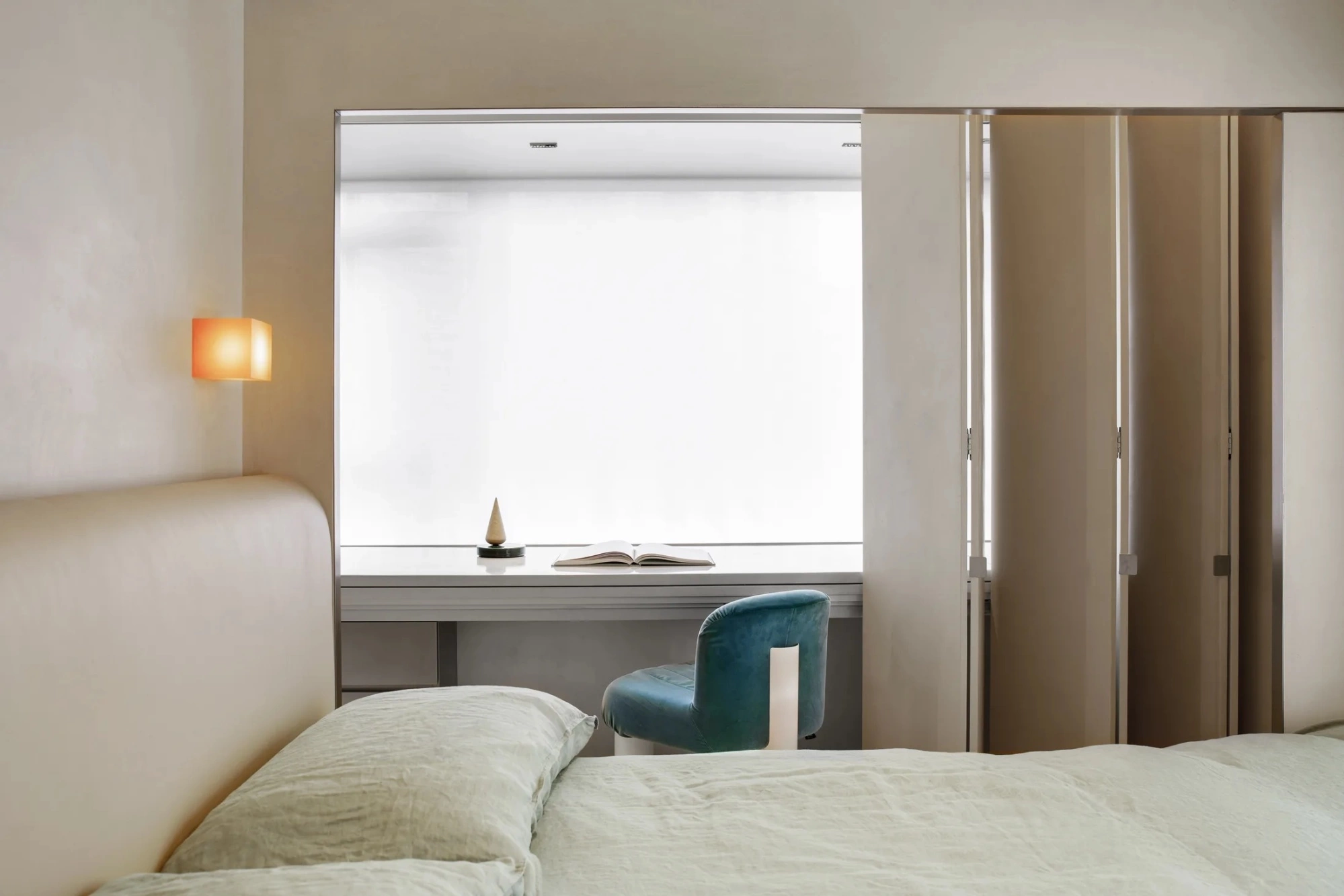 • Bàn làm việc nhỏ được bố trí liền kề phòng ngủ, ngăn bởi hệ cửa gấp xếp lớp: