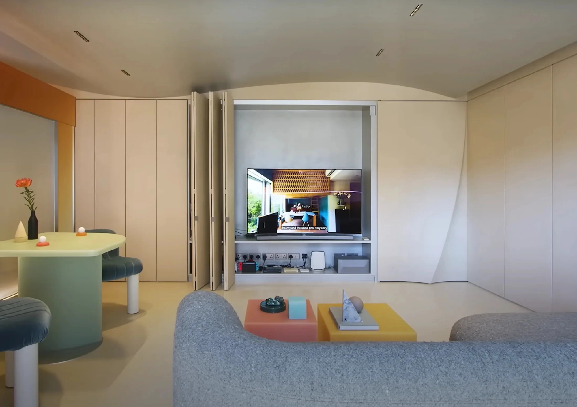 Căn hộ 59m2 ở Hồng Kông dùng hệ cửa gấp thay tường ngăn để giấu kho lưu trữ và góc giải trí, giúp không gian thoáng và rộng hơn diện tích thực