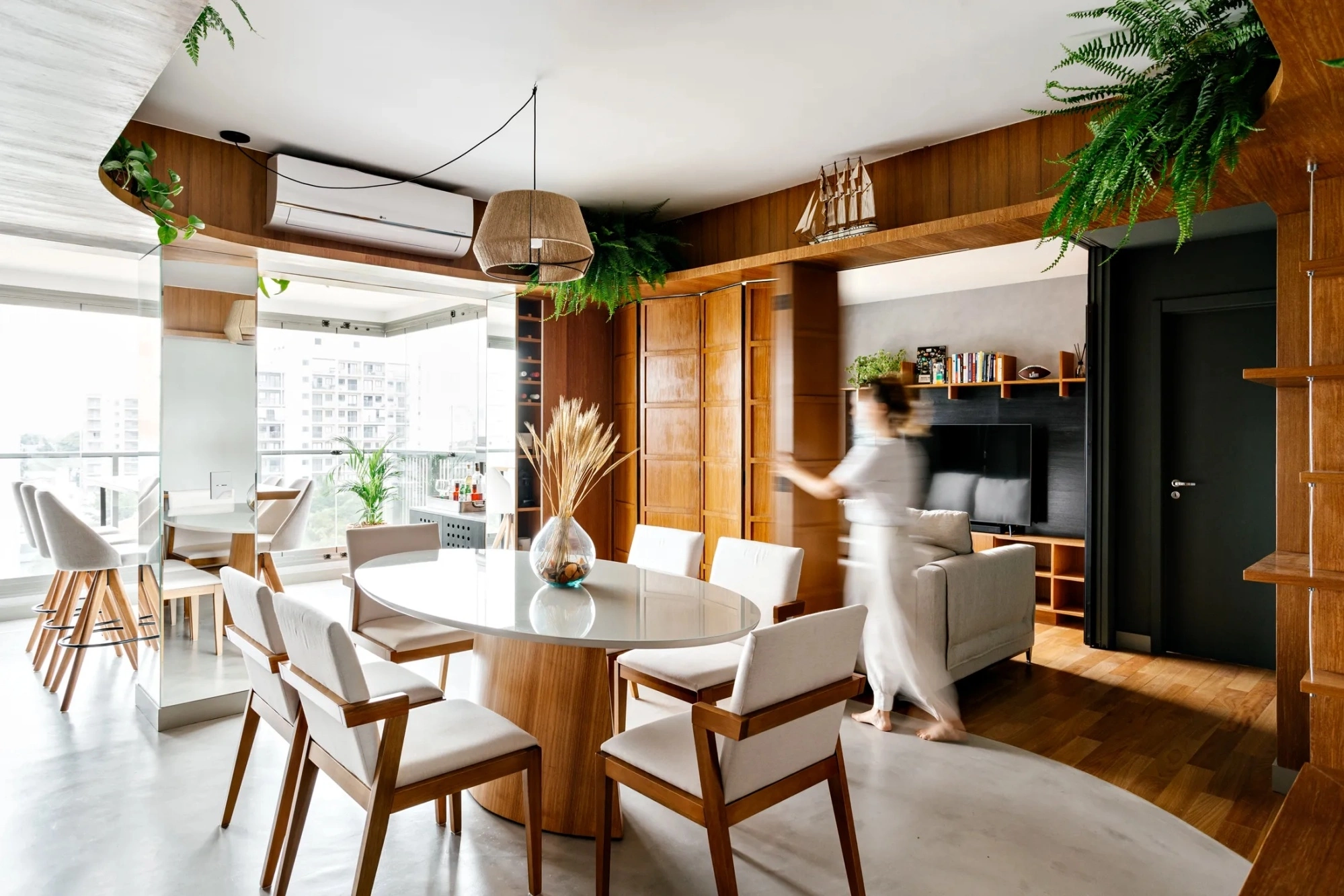 Căn hộ 56m2 ở São Paulo được cải tạo bằng hệ cửa gỗ gấp kết hợp tấm trượt thay cho tường ngăn, giúp không gian linh hoạt và thoáng hơn