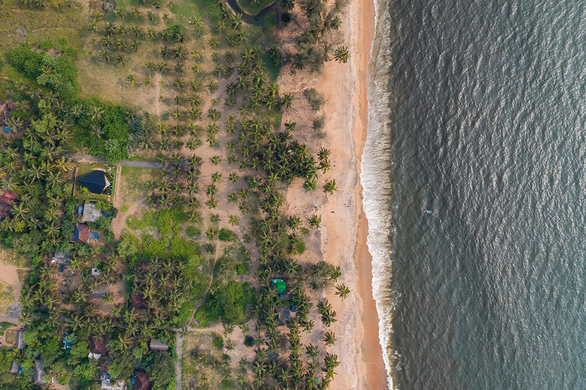 Bối cảnh khu đất sát biển Arab với dải cát dài và hàng dừa chạy dọc bờ. Công trình khai thác lợi thế hướng biển nhưng vẫn giữ lớp đệm cảnh quan tự nhiên