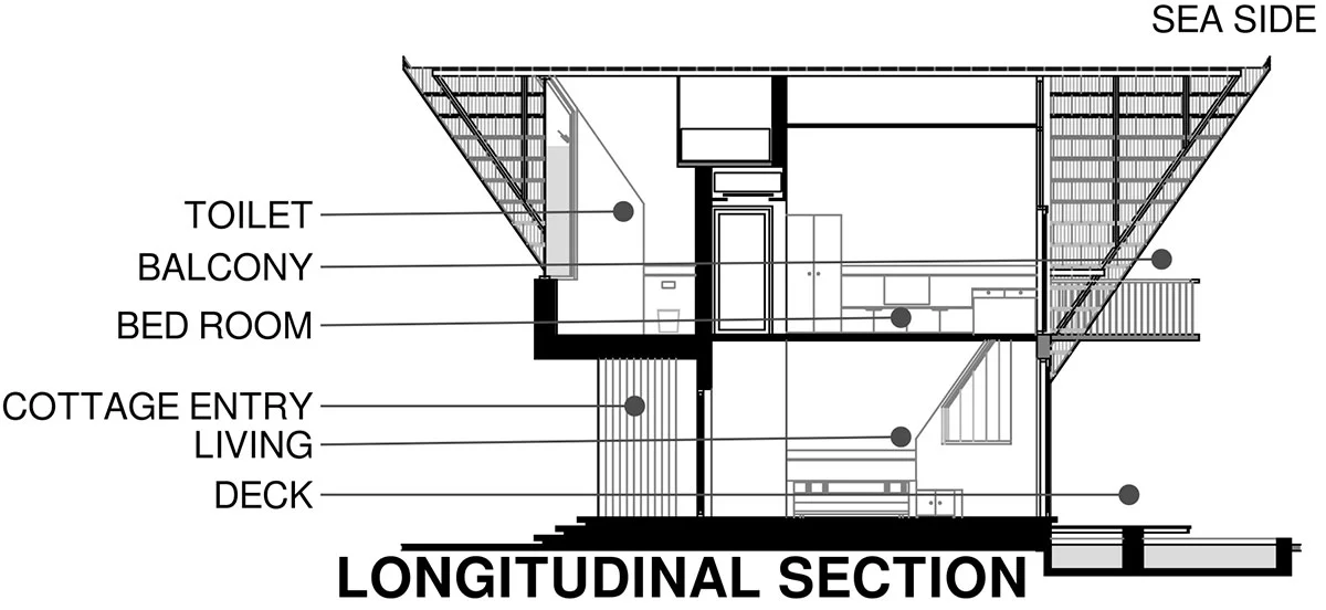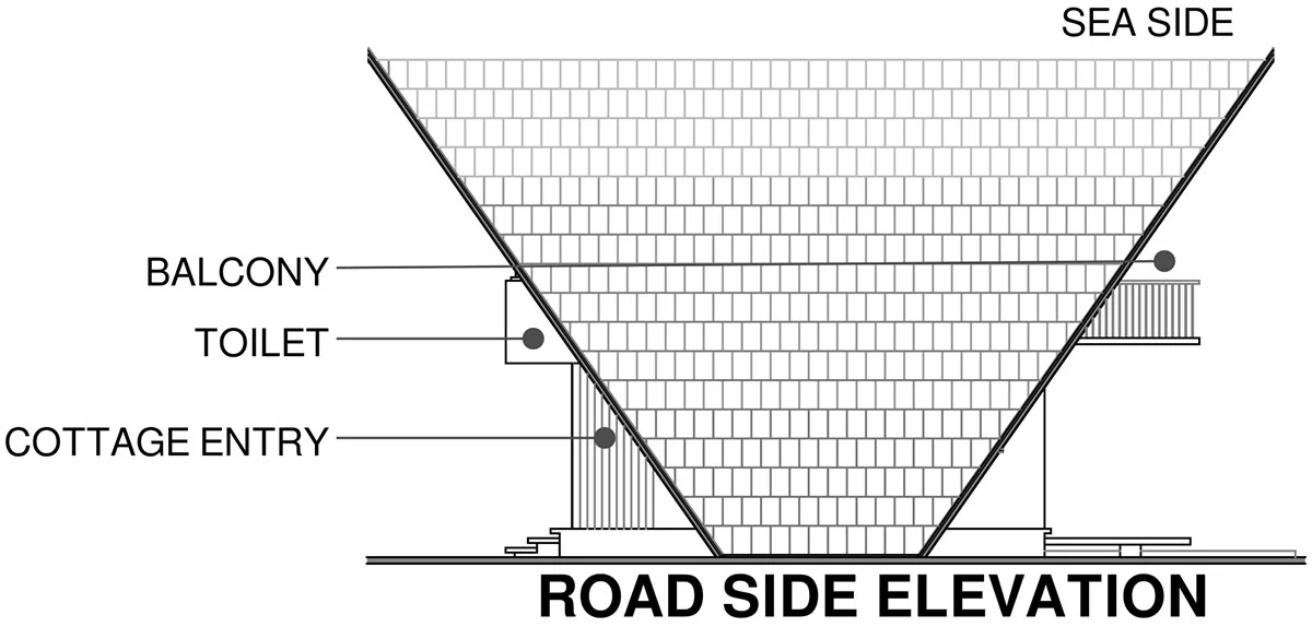 Từ đề bài này, nhóm kiến trúc sư Bhoomija Creations chọn hình khối nhà chữ A (hình thức mái dốc hai bên) khép kín về phía khu dân cư nhưng mở rộng tối đa hướng ra biển, tạo trải nghiệm sống thanh bình giữa cảnh quan ven biển trong giới hạn diện tích 93m2 (1000 sq.ft).