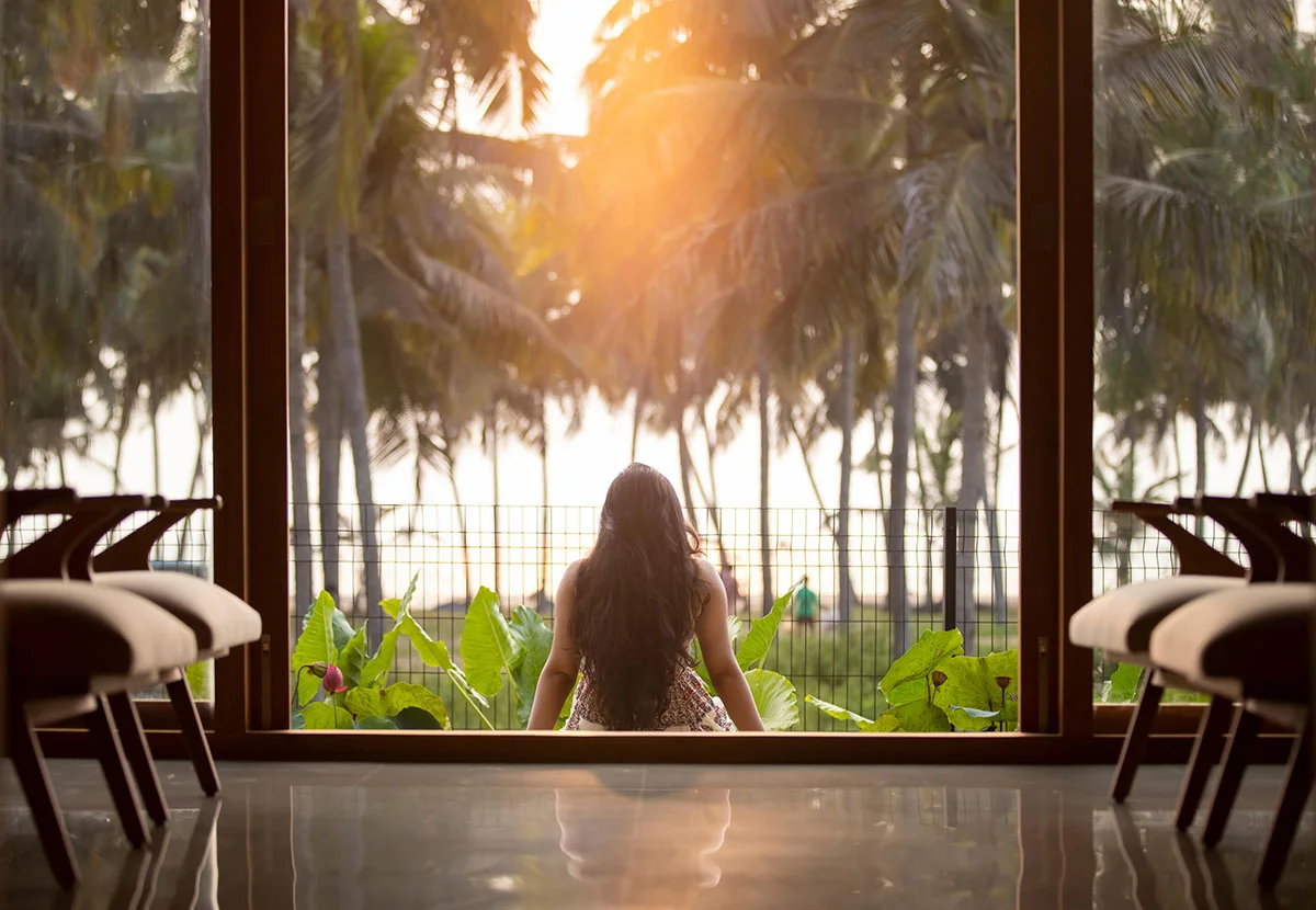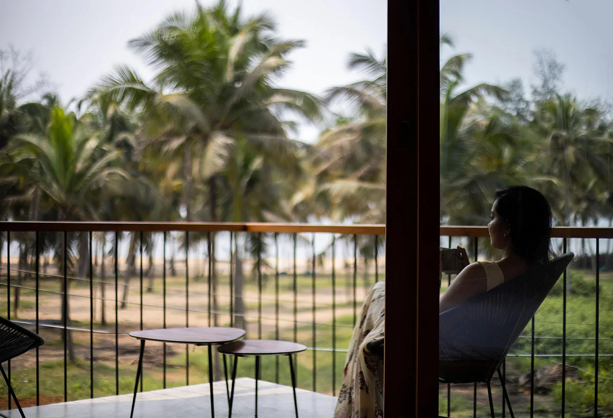Từ ghế thư giãn, người ở có thể nhìn qua khung cửa gỗ ra hàng dừa và bãi biển phía xa. Giải pháp mở chọn lọc tạo trải nghiệm ‘trong - ngoài’ liền mạch, đầy thư thái
