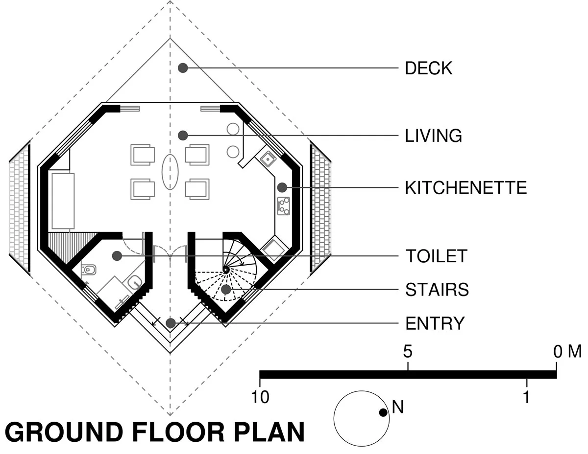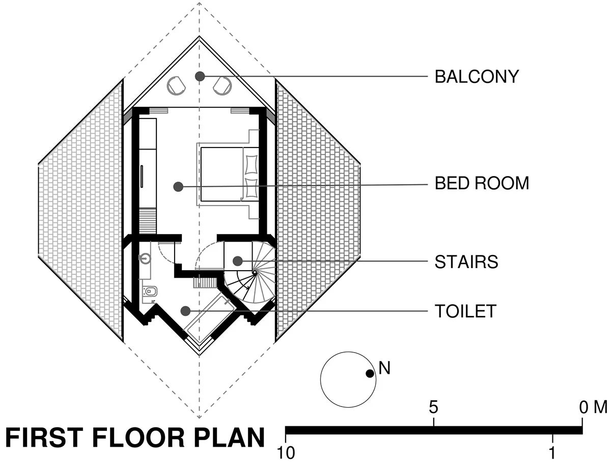 Khu bếp (kitchenette) được bố trí lệch khỏi trục nhìn chính, được mảng tường che nhẹ nhàng. Dù diện tích khiêm tốn, bếp vẫn đủ chức năng cho kỳ nghỉ ngắn. Thay cho thang thẳng chiếm chỗ, cầu thang xoắn đặt giữa nhà đóng vai trò trục giao thông dọc. Hai phòng vệ sinh bố trí đối xứng quanh lõi thang, tận dụng tối đa khoảng trống, giảm chiều dài di chuyển và tạo điểm nhấn điêu khắc dưới mái chữ A.