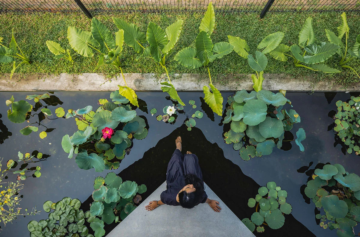 Mái dốc lớn trùm xuống tạo bóng đổ sâu, phía dưới là hồ sen ôm lấy chân nhà. Giải pháp vừa hạ nhiệt vi khí hậu, vừa tăng riêng tư cho sàn ngoài trời