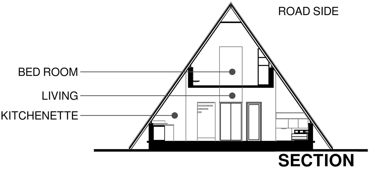 Mặt cắt ngang cho thấy cách mái dốc hình chữ A bao trùm toàn bộ cấu trúc. Các không gian sinh hoạt chính được tổ chức gọn gàng trong chiều cao mái, giúp thông gió và lấy sáng tự nhiên