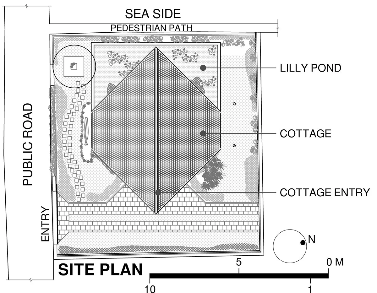 Công trình nằm trên khu đất khoảng 344m2 (8,5 cents), thuộc vùng quản lý bờ biển CRZ nhóm 3 (Coastal Regulation Zone - khu vực hạn chế quy mô xây dựng). Diện tích xây dựng tối đa vì thế chỉ 93m2 (1000 sq.ft). Bối cảnh xung quanh là khu ở của ngư dân và ngay cạnh lối xuống bãi biển, đòi hỏi công trình vừa kín đáo vừa khai thác lợi thế nhìn ra biển.