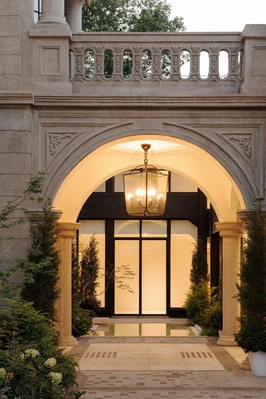 Lối vào biệt thự với mái vòm đá, đèn treo kim loại và sân lát đá dẫn xuống lớp cửa kính hiện đại. Thiết kế kết hợp ánh sáng vàng ấm và cây xanh như một “khoảng đệm” giúp người bước vào chuyển từ phố xá ồn ào sang không gian yên tĩnh.