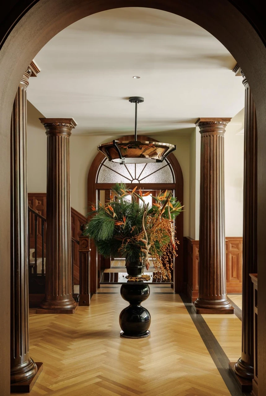 Sảnh trung tâm với hàng cột gỗ tròn, sàn xương cá và ánh sáng vàng ấm tạo cảm giác trang trọng khi bước vào nhà. Bình hoa nghệ thuật đặt ở trục chính trở thành điểm nhấn, giúp không gian giao thông mang tính “nghi thức” hơn.