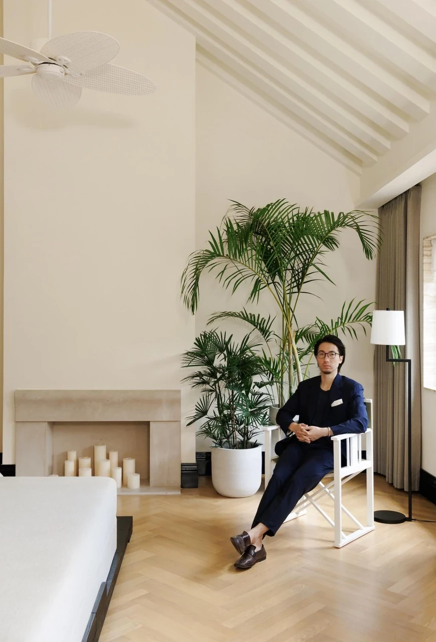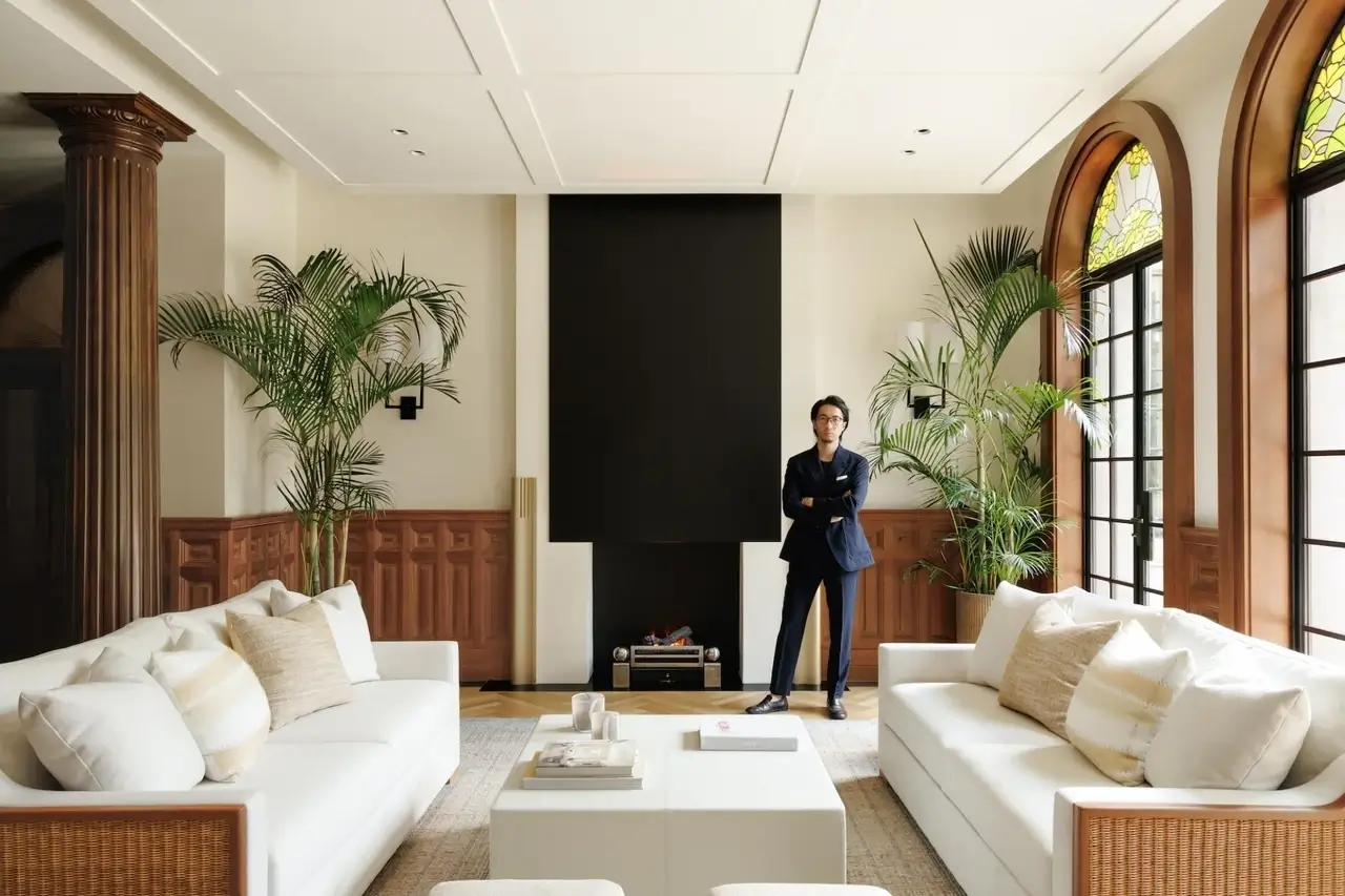 KTS Neal Zhu-yue chụp ảnh tại phòng khách chính của căn biệt thự sau cải tạo. Cây cọ lớn và ánh sáng tự nhiên giúp làm mềm không gian tân cổ điển, mang đến cảm giác nghỉ dưỡng thư giãn.
