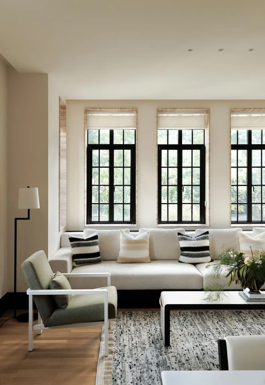 Không gian sinh hoạt chung với sofa dài, gối tông trung tính và dãy cửa sổ khung thép nhìn ra vườn. Ánh sáng tự nhiên được làm dịu bởi rèm roman và nội thất bo tròn, tạo môi trường thư giãn an toàn cho mẹ và bé.