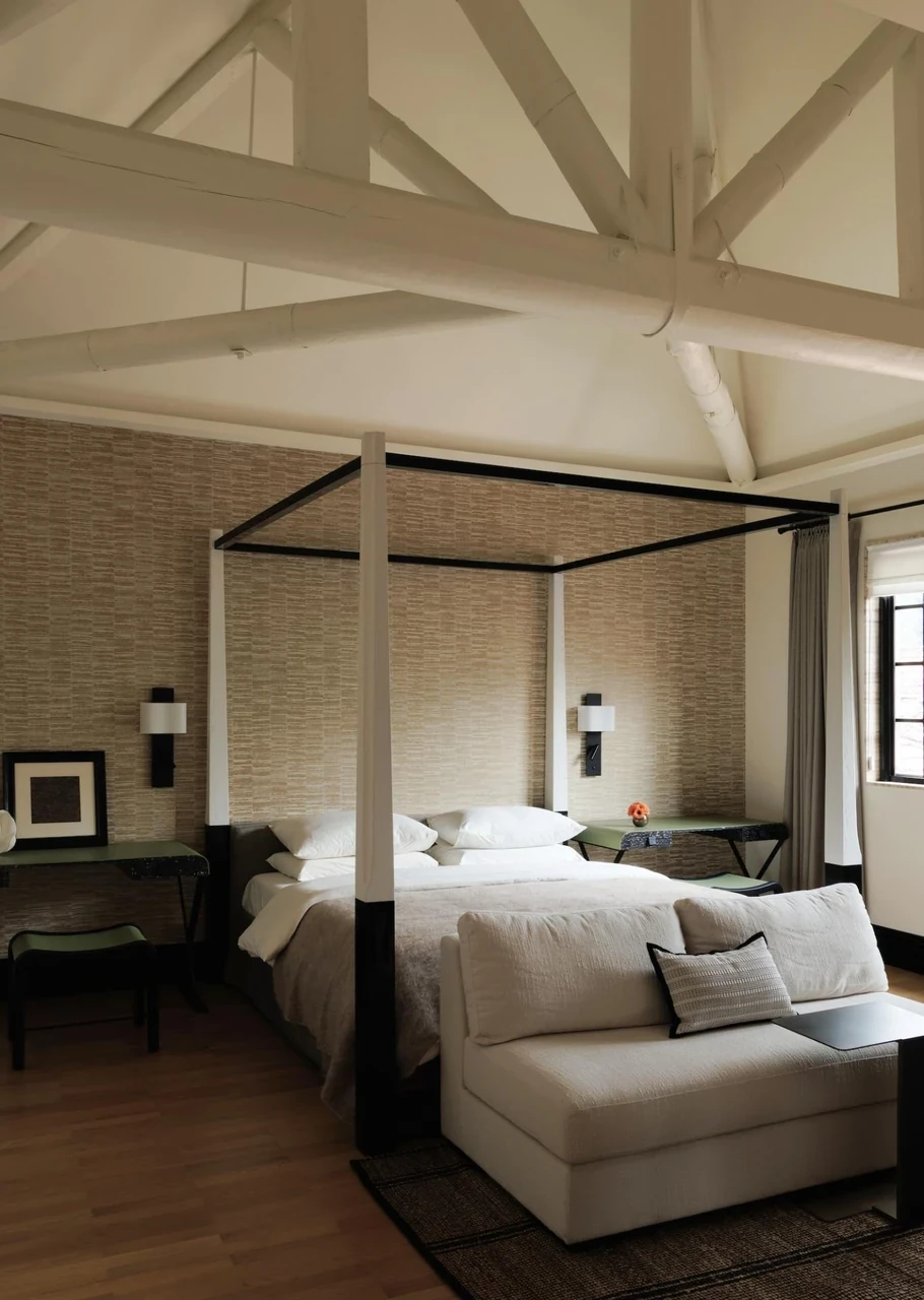 Suite riêng với giường bốn cột, sofa thấp và bàn console xanh olive tạo cảm giác sang trọng nhưng không cầu kỳ. Trần lộ xà gỗ và giấy dán tường texture nhẹ giúp phòng rộng hơn và giữ chất cổ điển tinh tế của biệt thự.