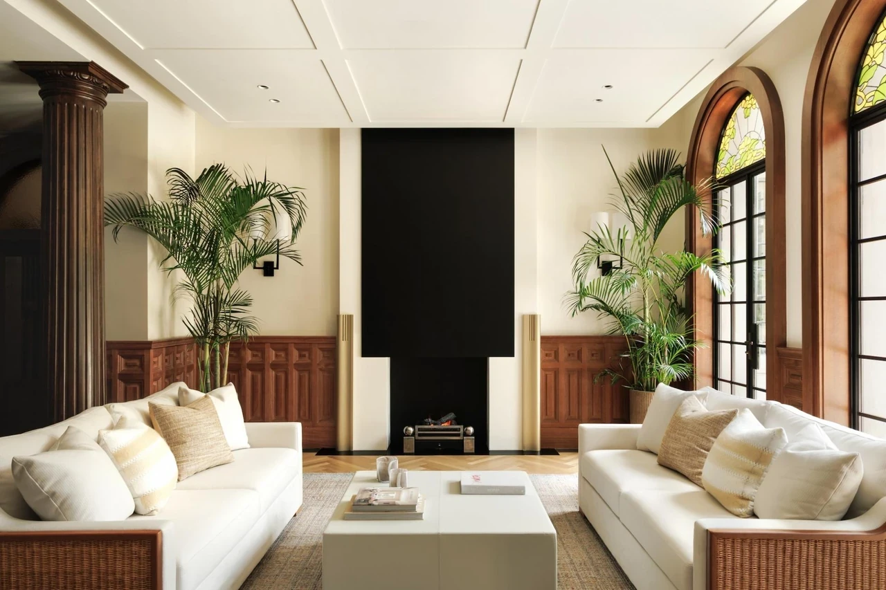 Góc nhìn cận vào phòng khách cho thấy bố cục đối xứng, sofa trắng và mảng tường lò sưởi đen nổi bật trên nền gỗ teak ấm. Việc tiết chế décor và dùng cây xanh cao giúp không gian sang trọng nhưng vẫn thoáng và dễ chịu.