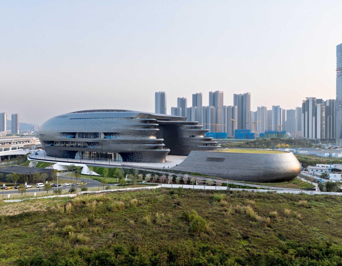 Toàn cảnh bảo tàng Khoa học và Công nghệ Thâm Quyến hiện lên như một con tàu vũ trụ tráng lệ giữa bối cảnh đô thị đang phát triển mạnh mẽ