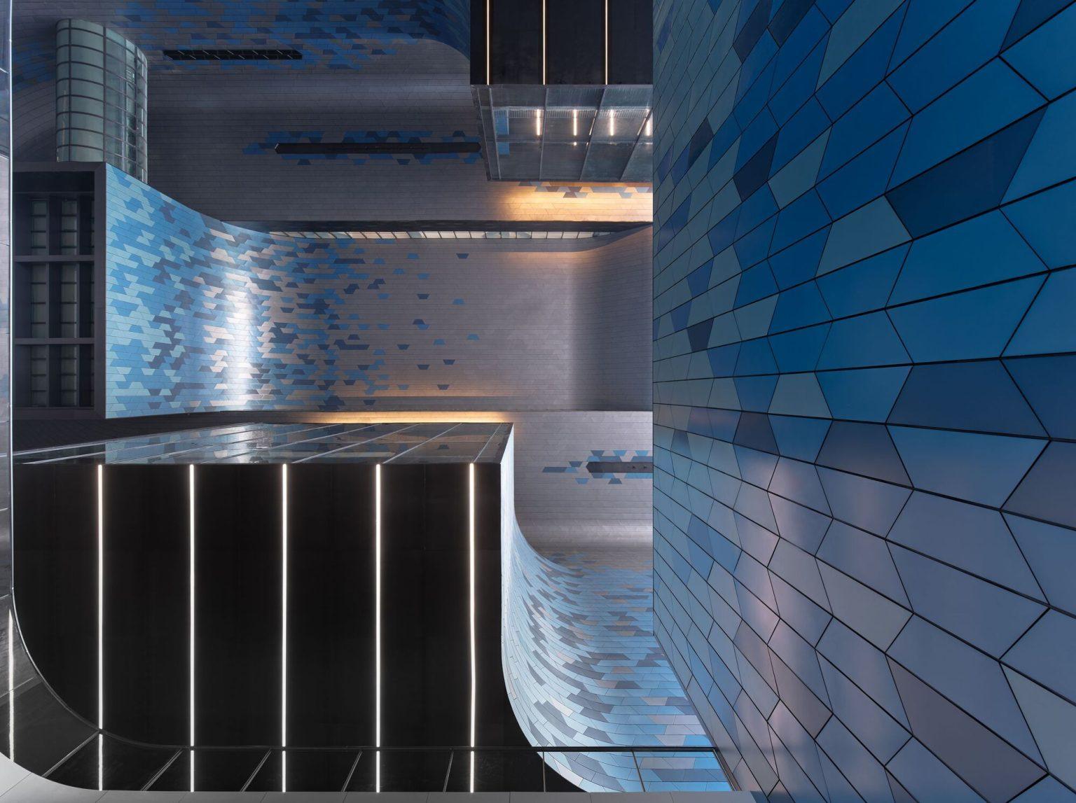 Đây là lần đầu tiên công nghệ này được ứng dụng ở quy mô lớn như vậy tại Trung Quốc. Bằng cách kiểm soát chính xác công thức điện phân và thời gian oxy hóa, các kiến trúc sư đã tạo ra một phản ứng giả kim thuật ngay trên bề mặt kim loại. Tấm áo thép không sở hữu khả năng chuyển màu kỳ ảo nhờ một lớp màng oxit nano siêu mỏng. Dưới sự thay đổi của góc nhìn và ánh sáng mặt trời trong ngày, tòa nhà biến thiên sắc thái liên tục: từ màu xanh thẫm sâu thẳm của đại dương chuyển sang sắc xám bạc lấp lánh, rồi lại sáng lấp lánh ánh kim loại.