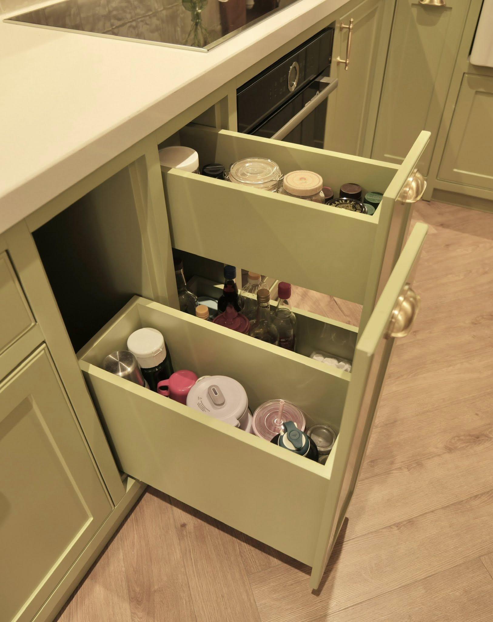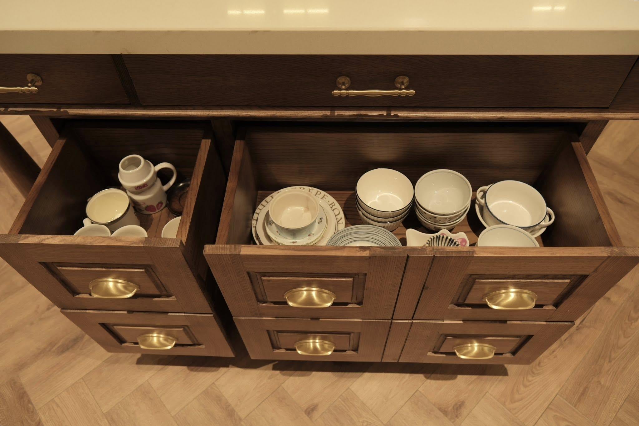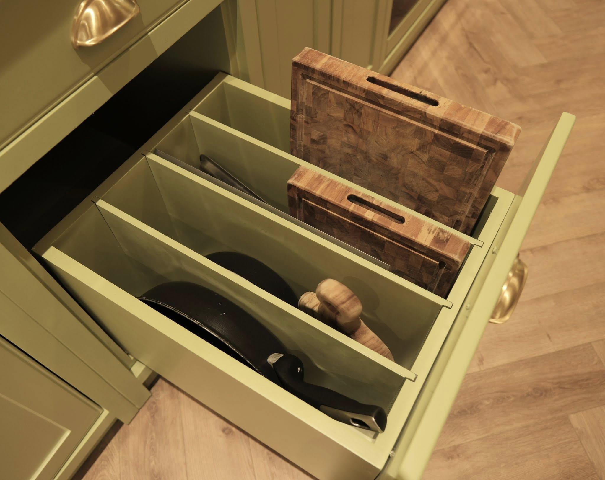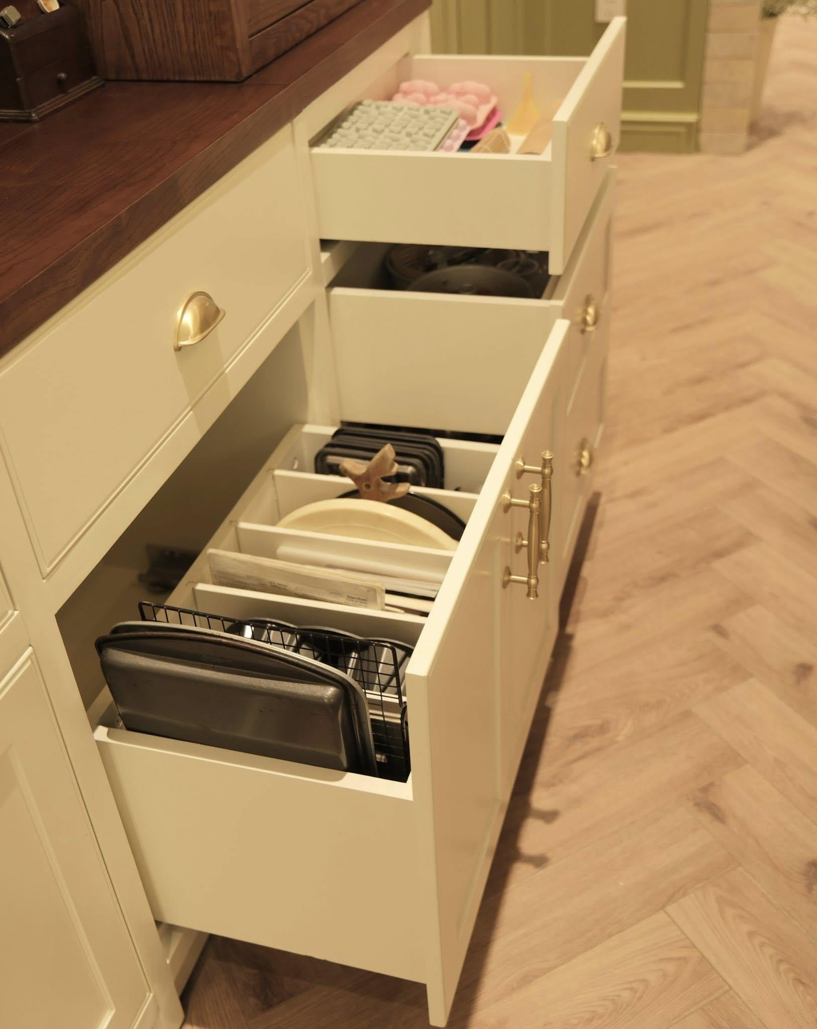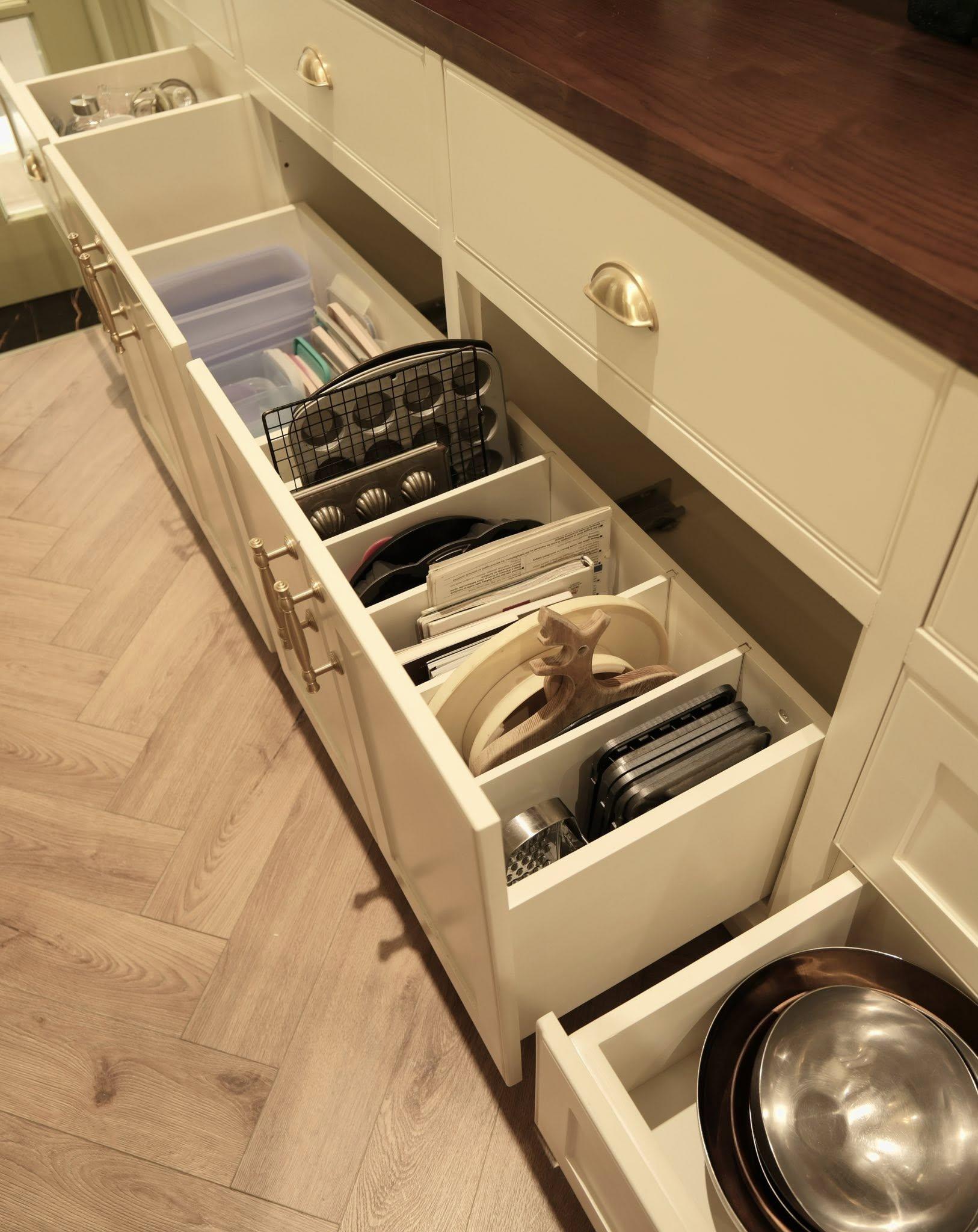 Các ngăn kéo lớn mình cũng chia nhỏ bằng các đợt di động để dễ dàng sắp xếp các loại chảo, khay, thớt