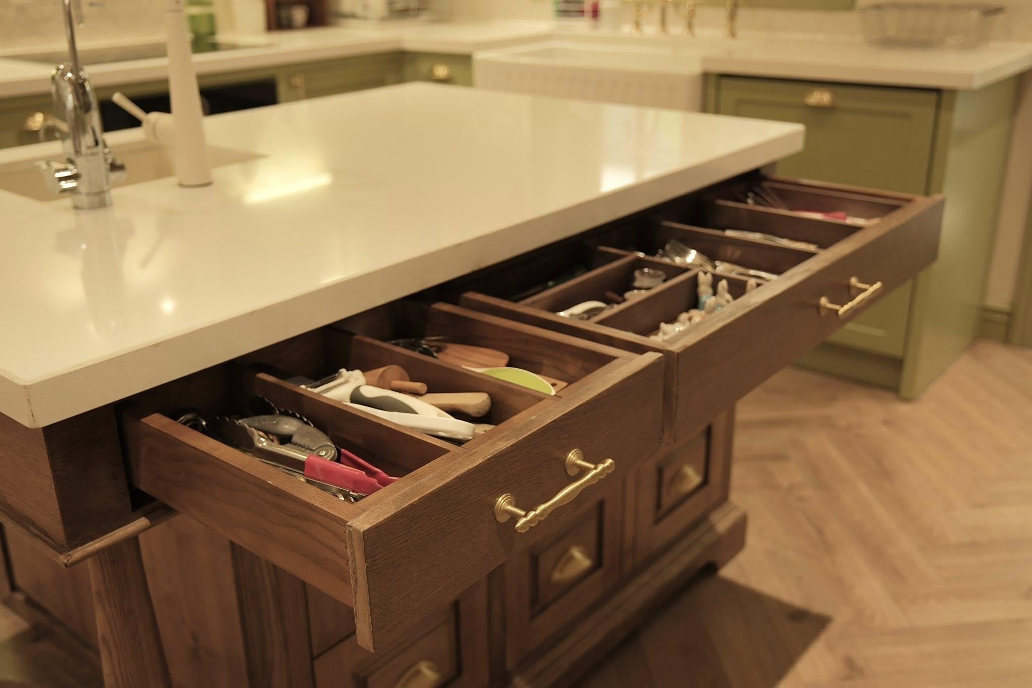 Các ngăn kéo được chia công năng riêng biệt và chia thành từng khay nhỏ để các bé có thể dễ dàng phân loại dao thìa đũa, bát đĩa