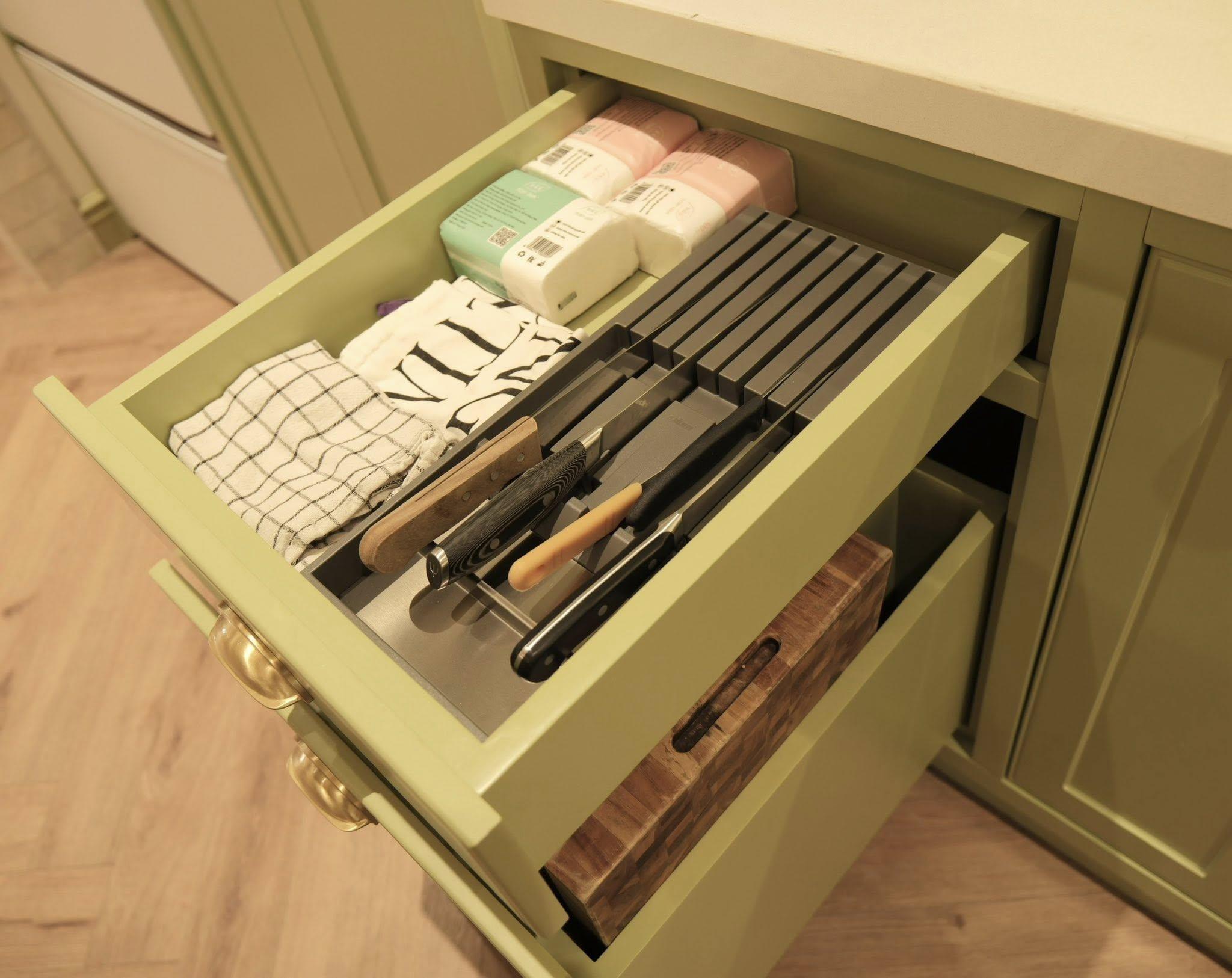 Ngăn kéo có khay để dao, khăn lau bát và giấy ăn được sắp xếp gọn gàng