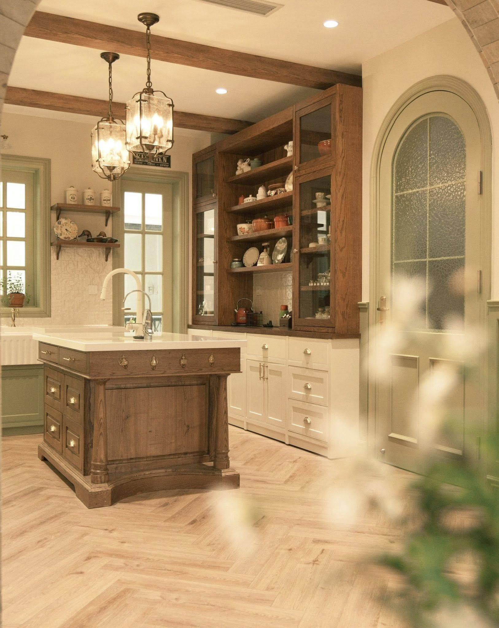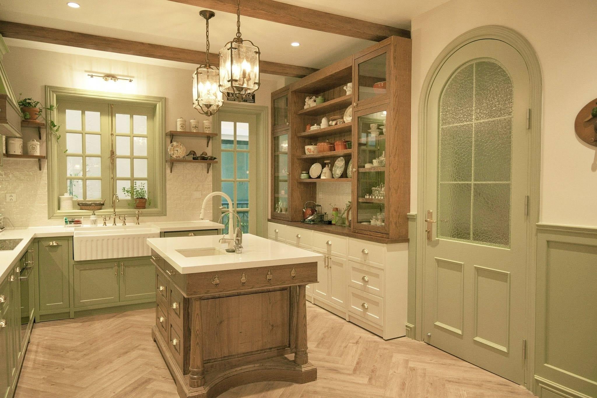 Không gian bếp được sơn tông xanh bơ dịu nhẹ, kết hợp hài hòa với hệ tủ gỗ màu hạt dẻ tạo cảm giác ấm cúng, vintage nhưng không cũ kỹ. Thiết kế bếp dạng chữ U với bàn đảo ở giữa không chỉ gia tăng diện tích thao tác mà còn phân chia các khu vực theo đúng tam giác công năng: khu sơ chế, nấu ăn, dọn rửa và lưu trữ. Đây là căn bếp đẹp có cửa sổ, có ban công trồng cây xanh mướt, có bồn rửa bát bằng sứ vintage nhìn ra không gian đầy thơ mộng - là nơi mỗi sáng có mùi bánh mì nướng, mỗi tối vang tiếng cười bữa cơm sum họp.