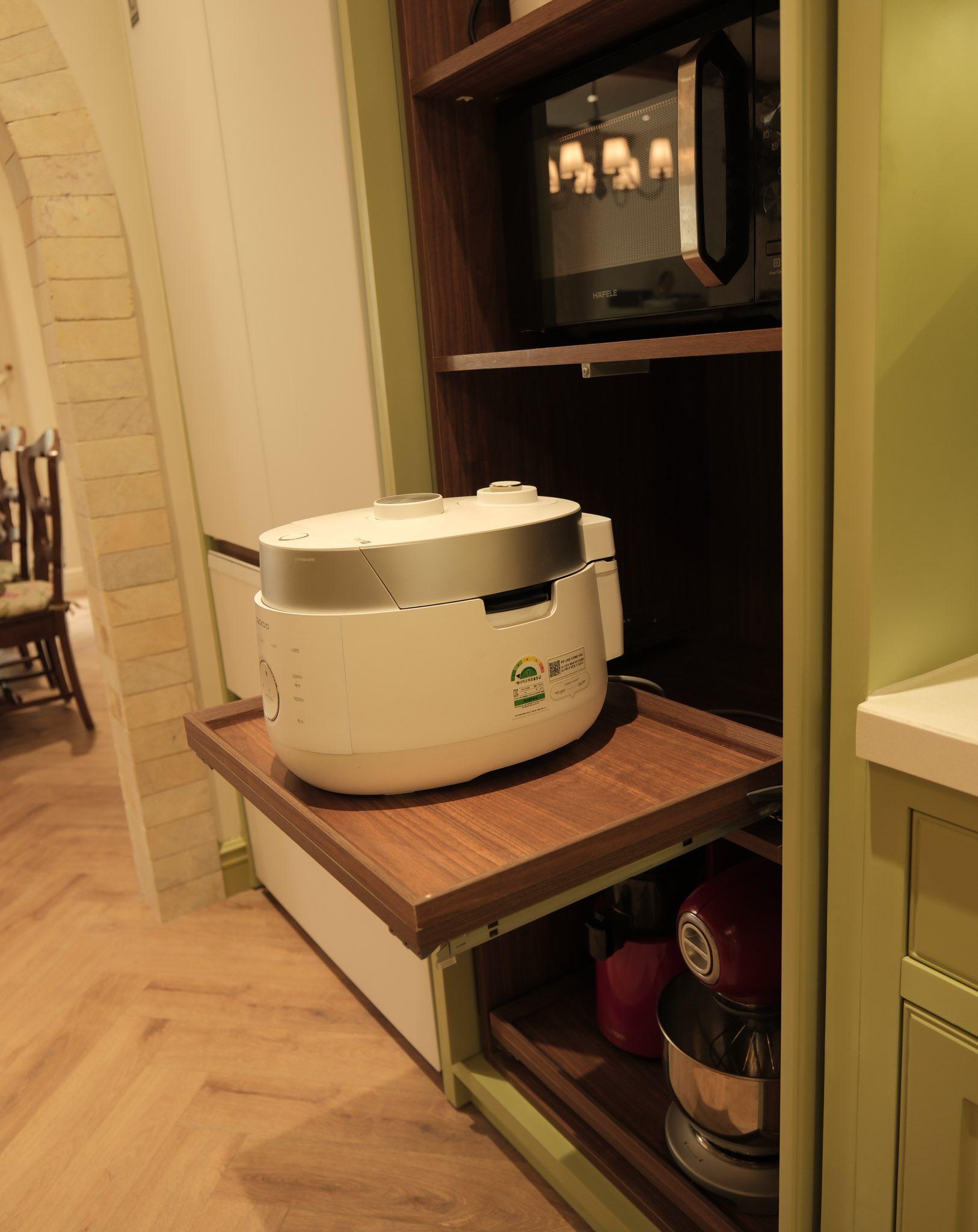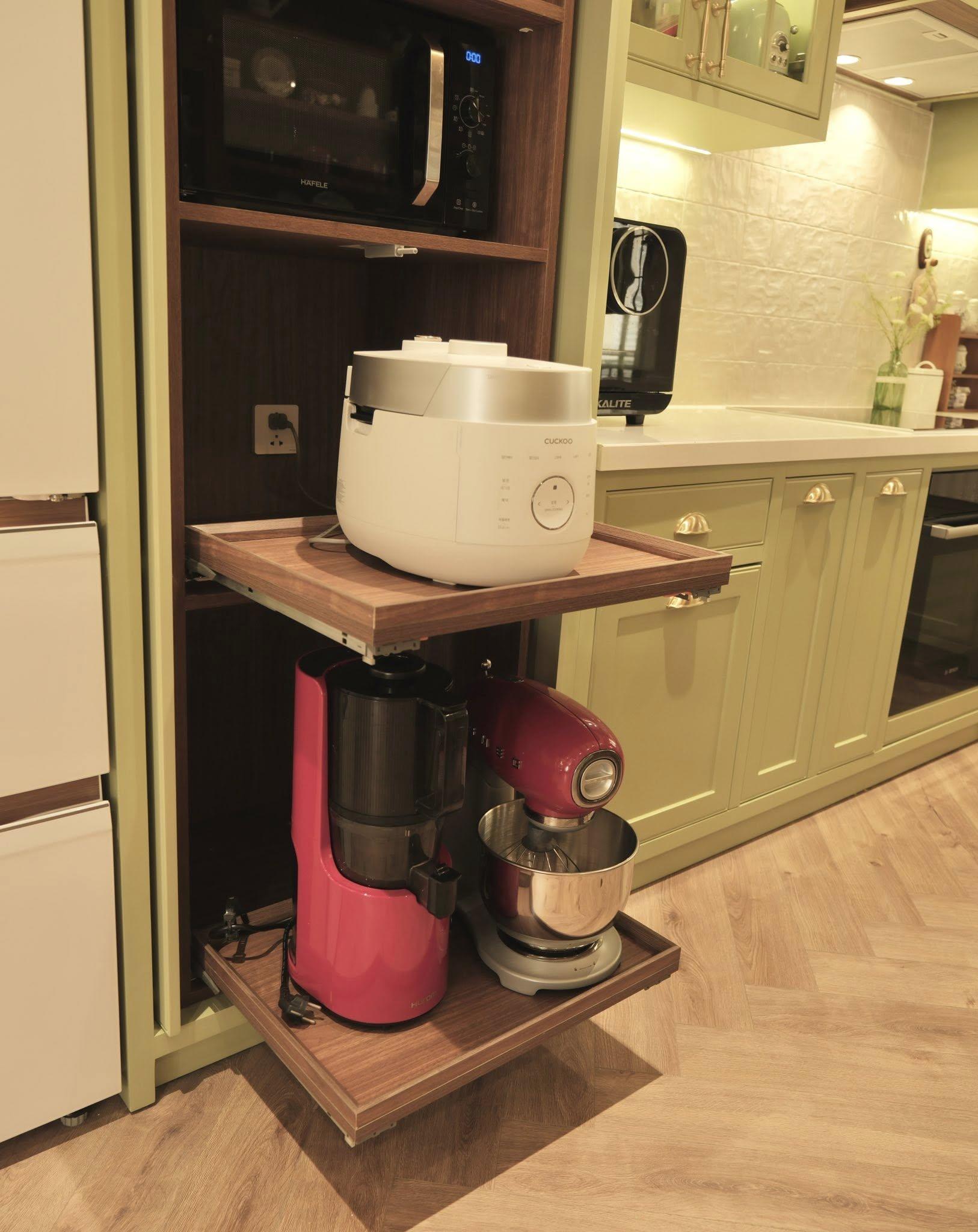 Mình thiết kế riêng khoang tủ gia dụng có kệ trượt, khóa chống trượt và cơ chế đóng mở một tay bằng thanh đồng bộ - một giải pháp nhỏ nhưng vô cùng hiệu quả khi sử dụng nồi cơm điện, máy trộn bột hay máy ép chậm. Khi dùng xong, chỉ cần gạt nhẹ là kệ kéo sẽ trượt vào trong một cách êm ái.