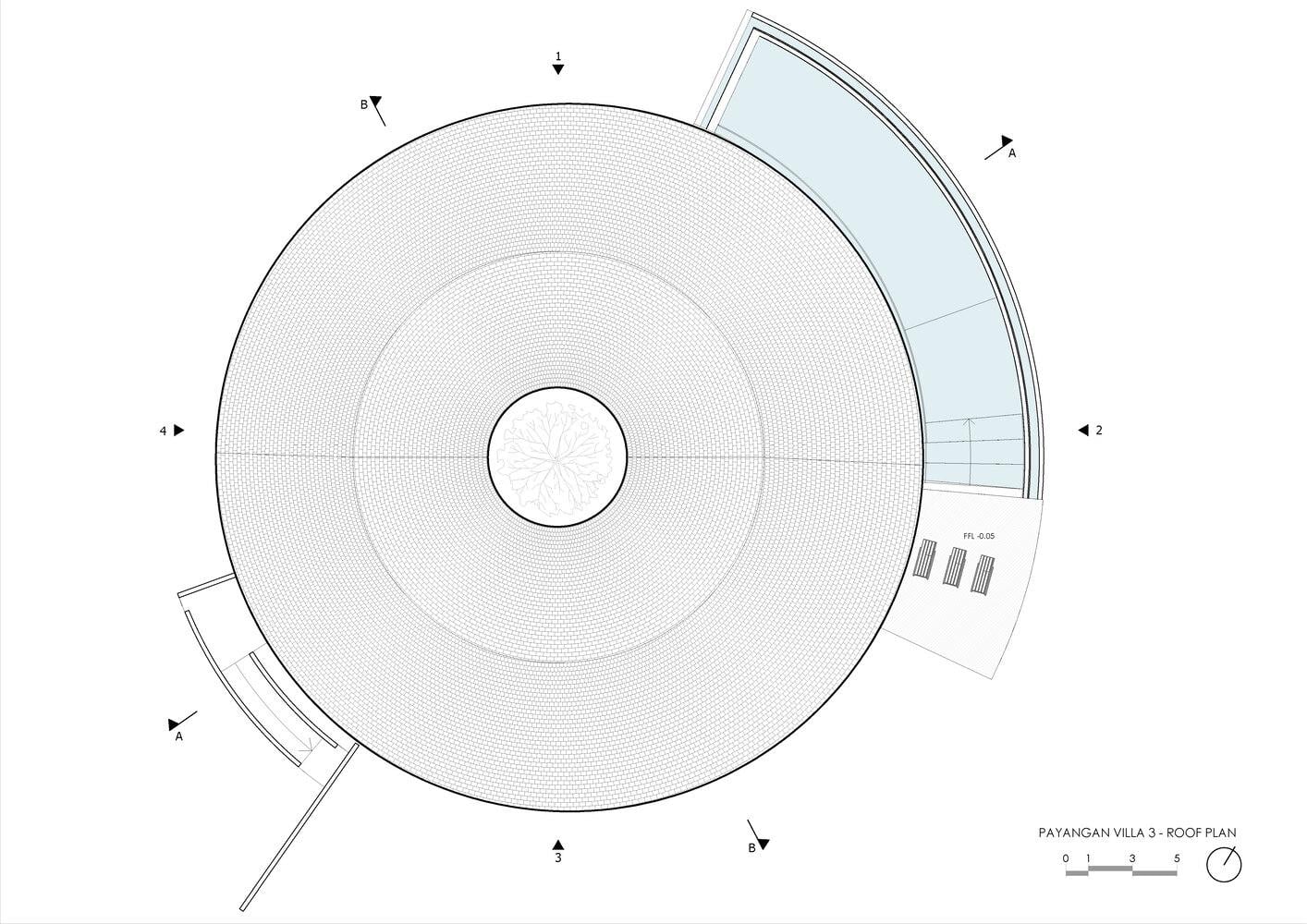 Toàn bộ ngôi nhà được tổ chức quanh một điểm trung tâm. Từ đó, các vòng tròn lan rộng ra ngoài, định hình nhiều yếu tố như mặt bằng, bể bơi, lối đi… Tâm điểm chung này thiết lập một trật tự không gian mang tính thiền định.