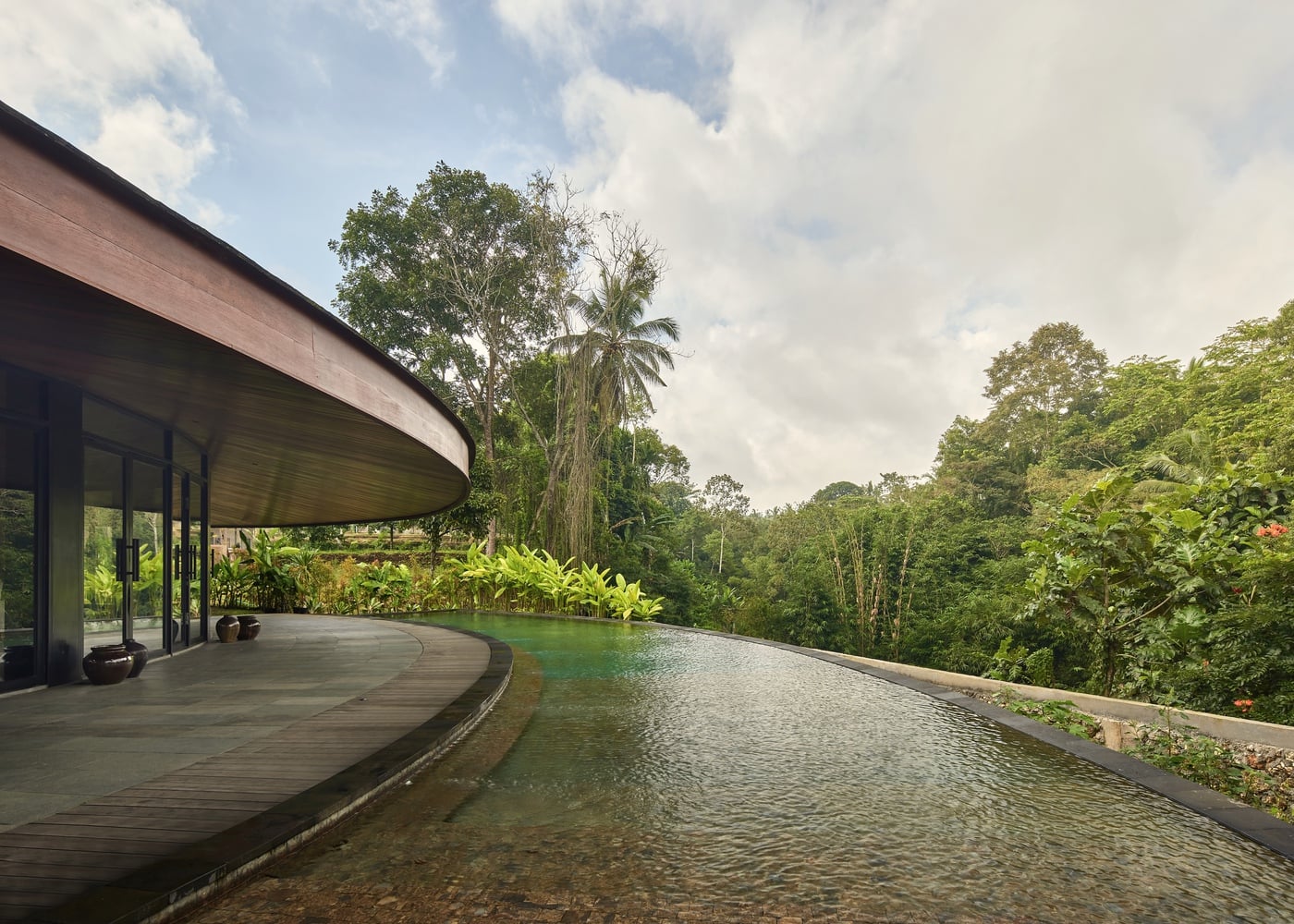 Bể bơi tràn bờ uốn theo đường cong của ngôi nhà, phản chiếu bầu trời và mảng xanh tĩnh lặng bao quanh. Từ bể bơi nhìn ra là cảnh quan núi đồi nhiệt đới trải dài - một bức tranh thiên nhiên tuyệt đẹp