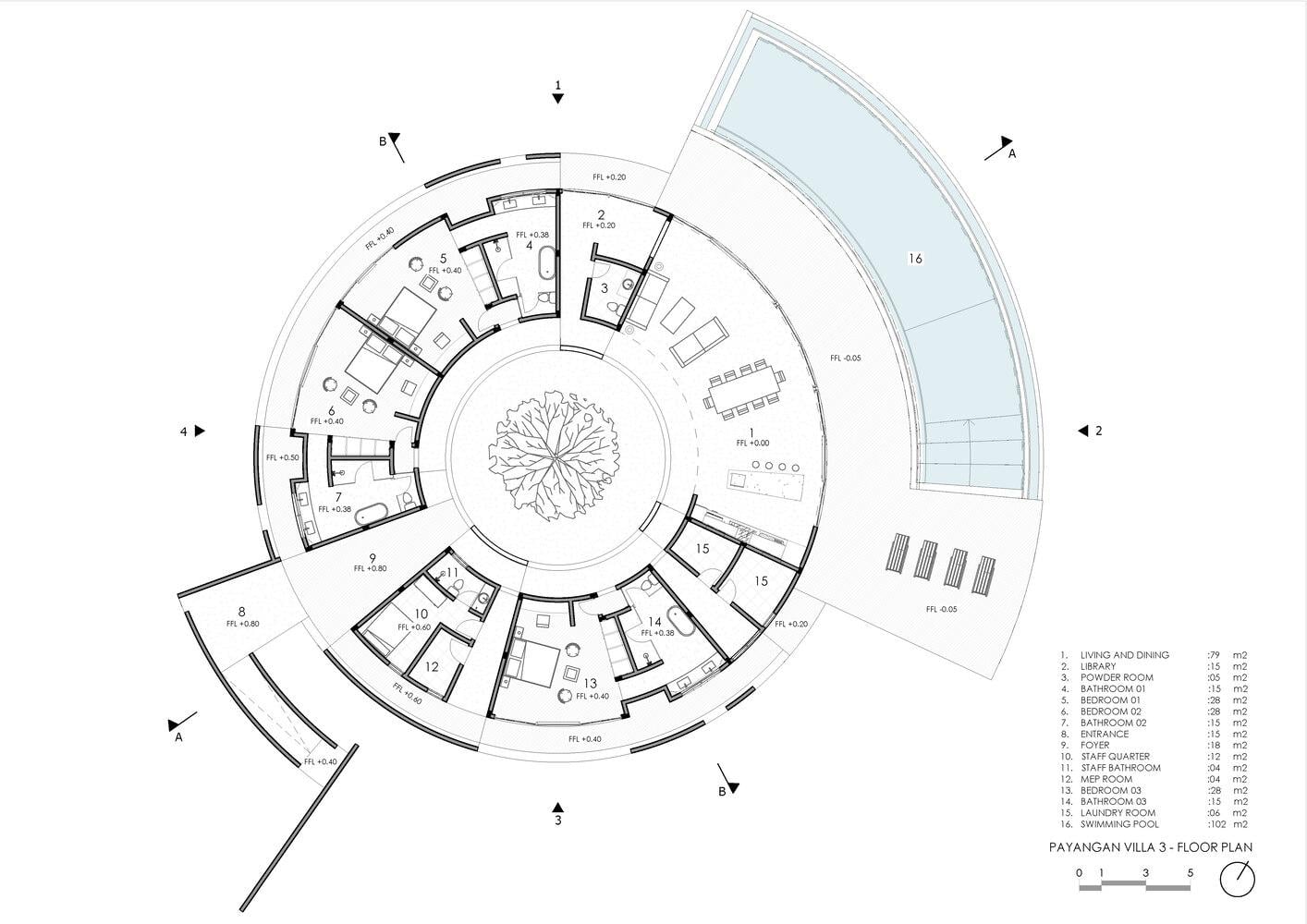 Dự án triển khai dựa trên thủ pháp thiết kế hình học rõ ràng: mặt bằng hình tròn với các chức năng được phân bổ dọc theo chu vi, hướng tầm nhìn ra cảnh quan bao quanh.