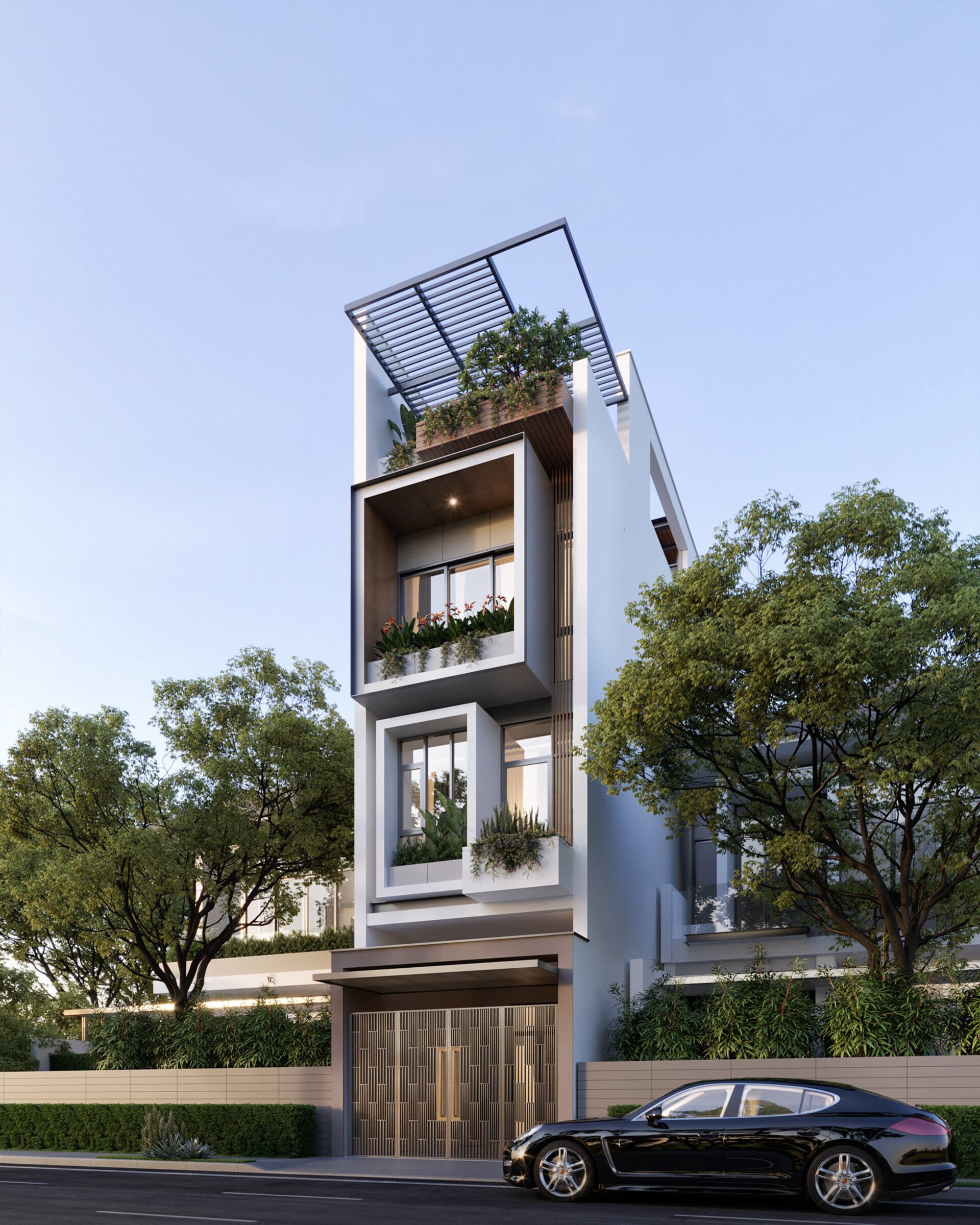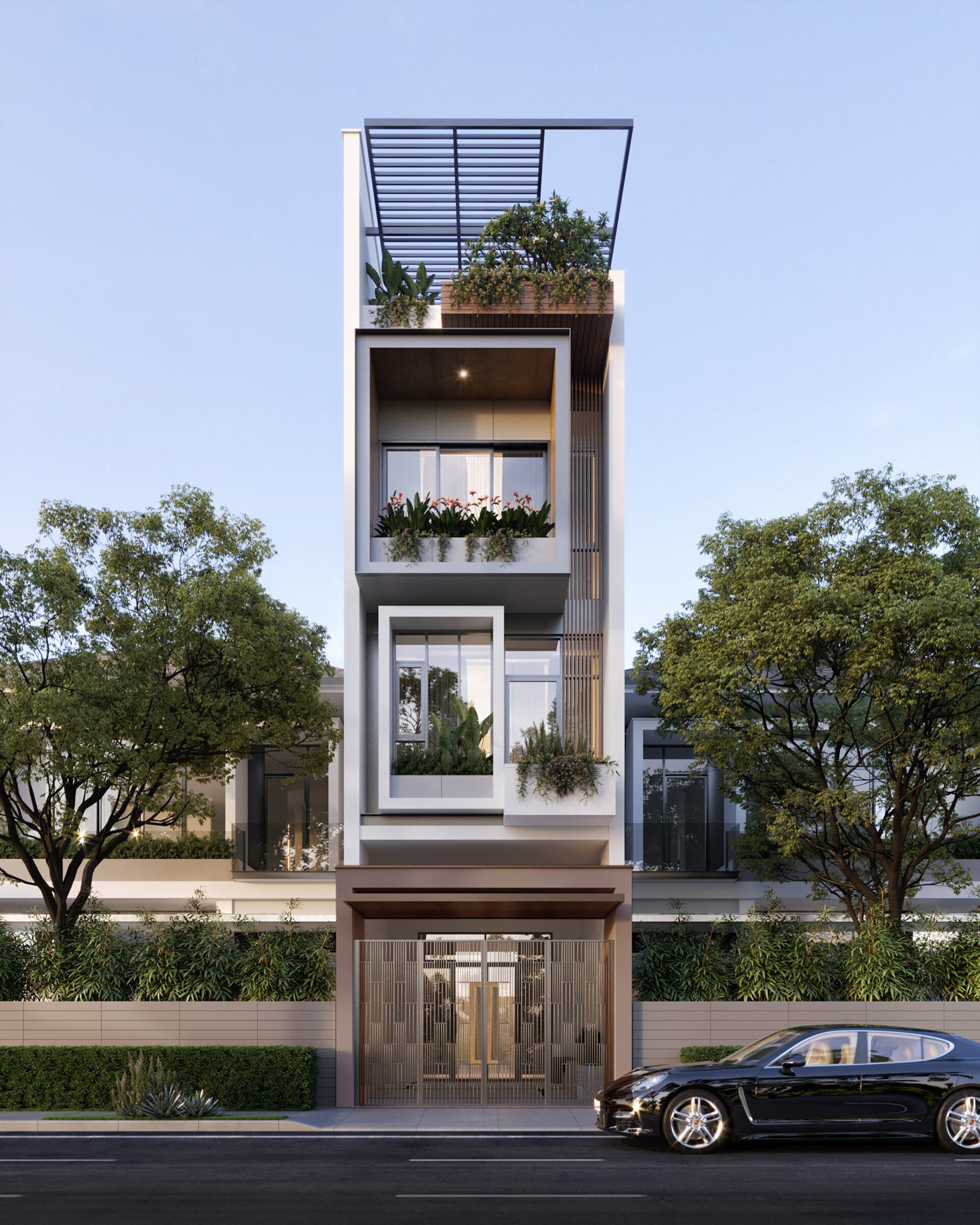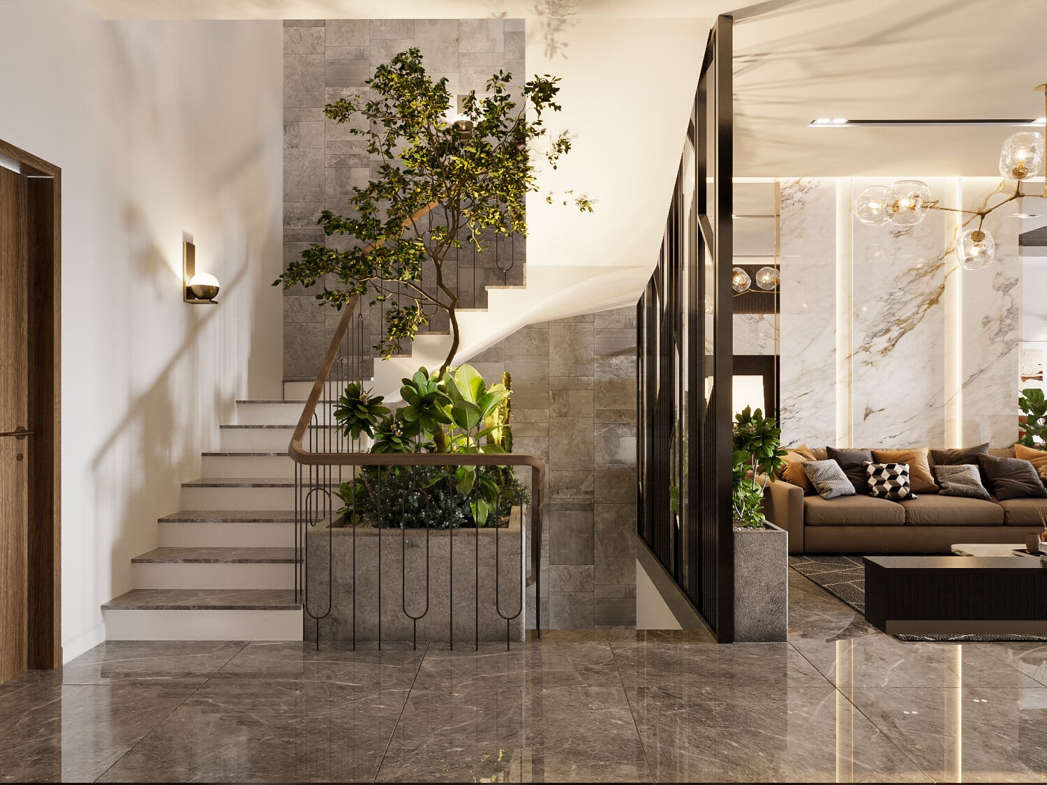 Thiết kế mở: Để giải quyết bài toán thiếu sáng thường thấy của nhà phố, đội ngũ KTS đã sử dụng hệ cửa kính lớn chạy dọc ban công các tầng. Giải pháp này không chỉ giúp tối ưu ánh sáng tự nhiên và thông gió mà còn xóa nhòa ranh giới giữa trong và ngoài nhà.
