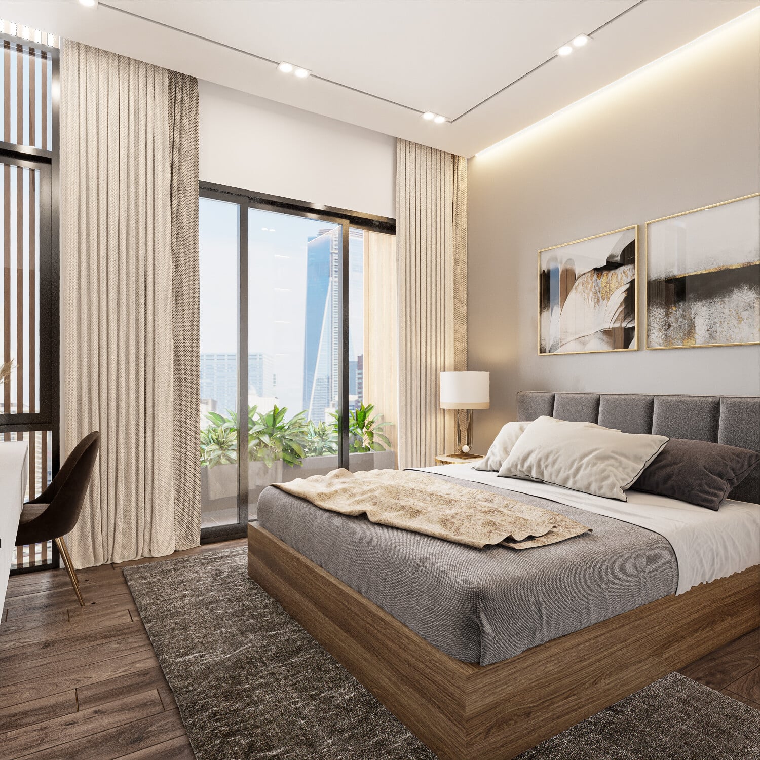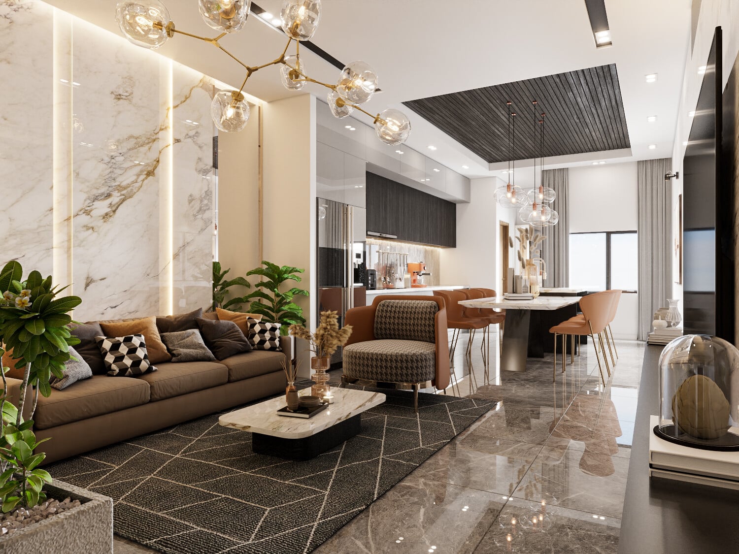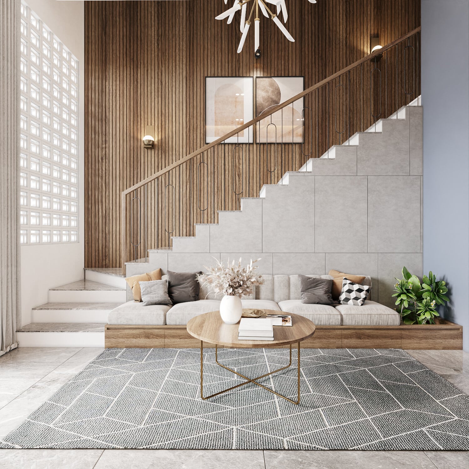 Vật liệu hiện đại: Sự kết hợp giữa tông màu trung tính, vật liệu gỗ ấm áp và cây xanh tại ban công tạo nên một diện mạo sang trọng nhưng vẫn rất gần gũi, giúp gia chủ xua tan căng thẳng mỗi khi trở về.